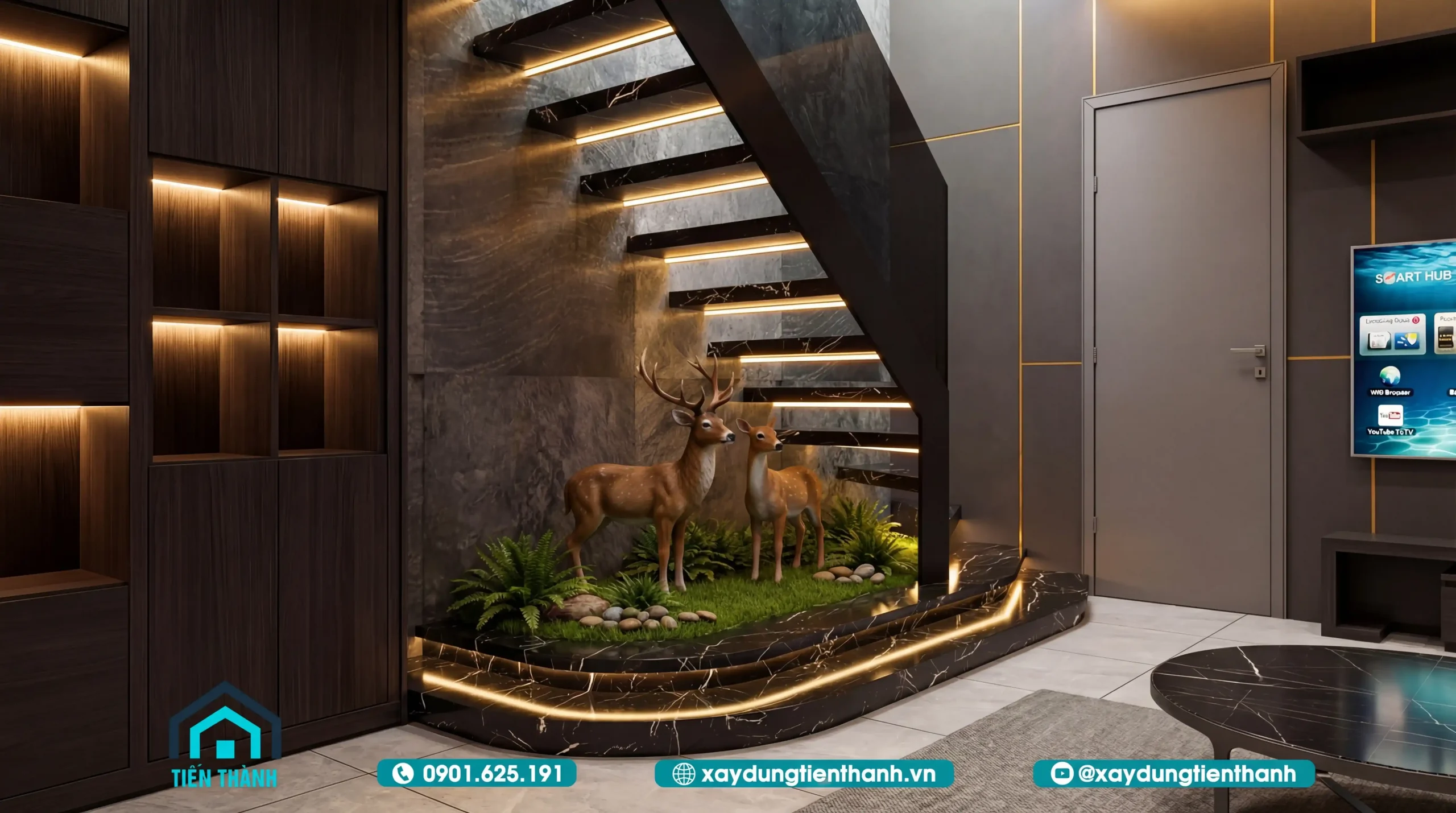 Dưới gầm cầu thang, thay vì để trống, kiến trúc sư đã thiết kế một tiểu cảnh khô với đôi hươu và thảm cỏ xanh, kết hợp cùng hệ thống đèn LED từng bậc thang. Đây là một cách xử lý không gian chết cực kỳ thông minh, biến cầu thang thành một tác phẩm nghệ thuật trong nhà.