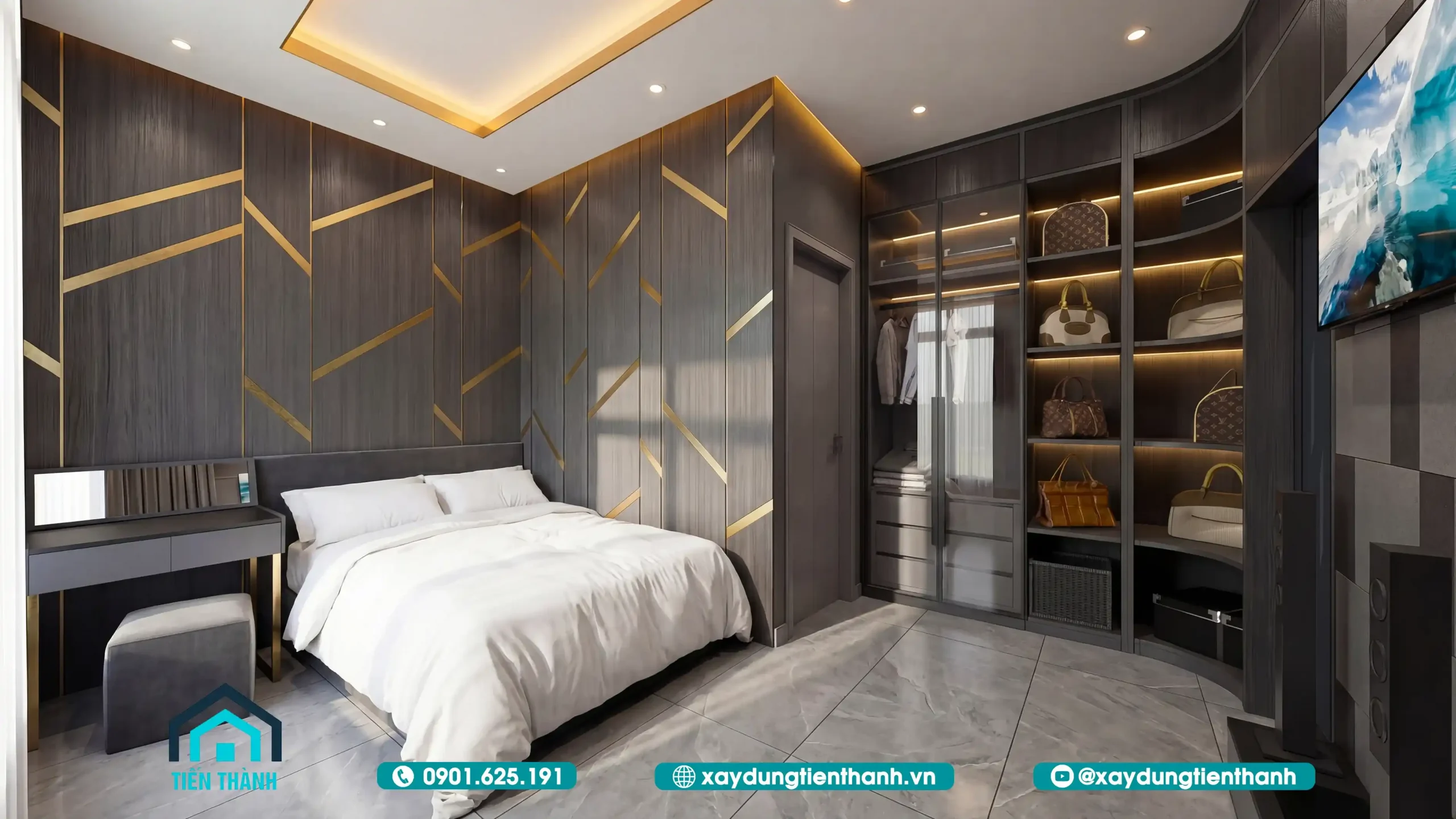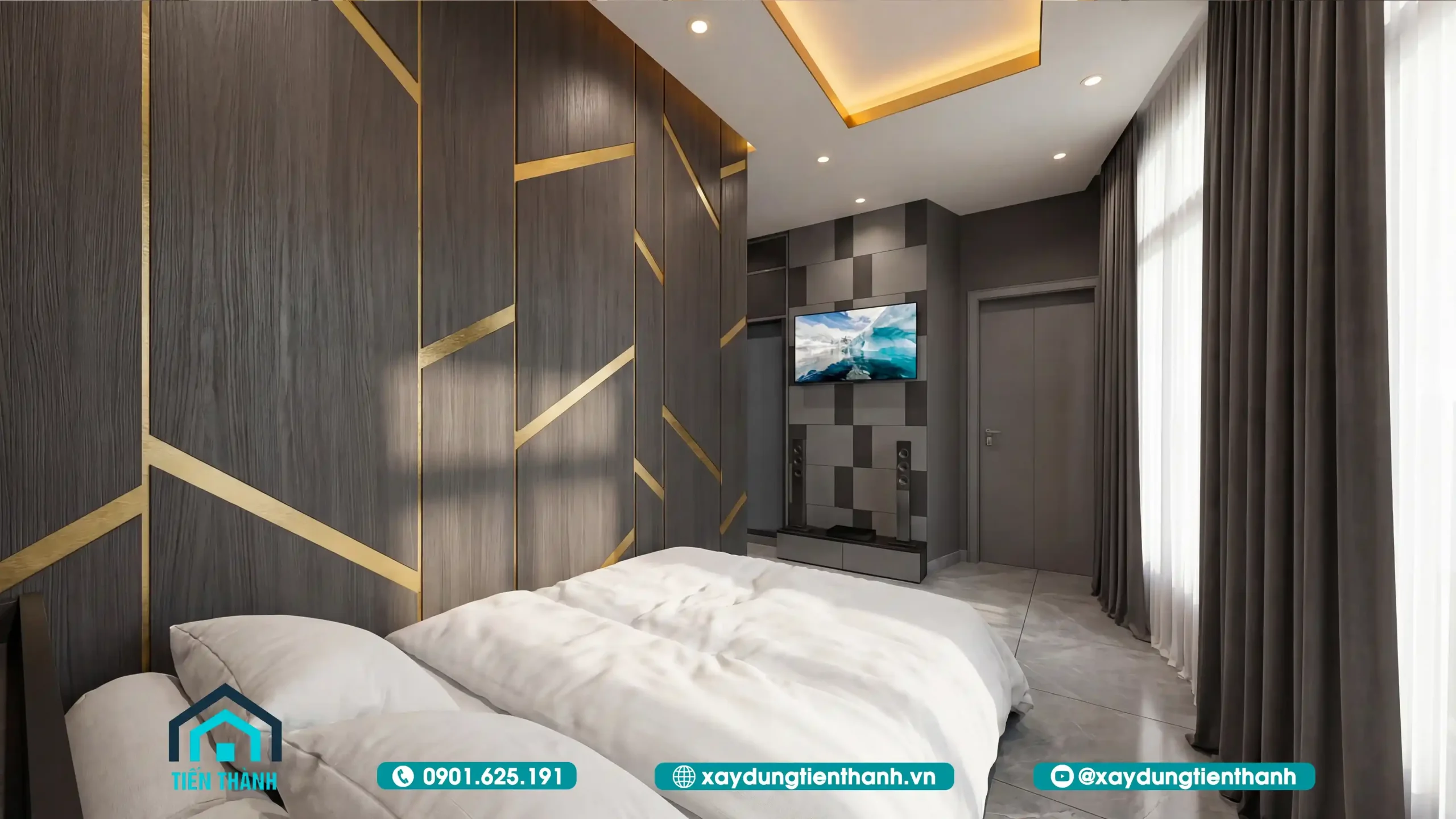 Di chuyển lên tầng lửng của mẫu nhà gác lửng 7×10, chúng ta sẽ choáng ngợp trước không gian phòng ngủ Master. Đây là nơi được đầu tư kỹ lưỡng nhất về mặt thẩm mỹ để mang lại giấc ngủ trọn vẹn cho gia chủ.