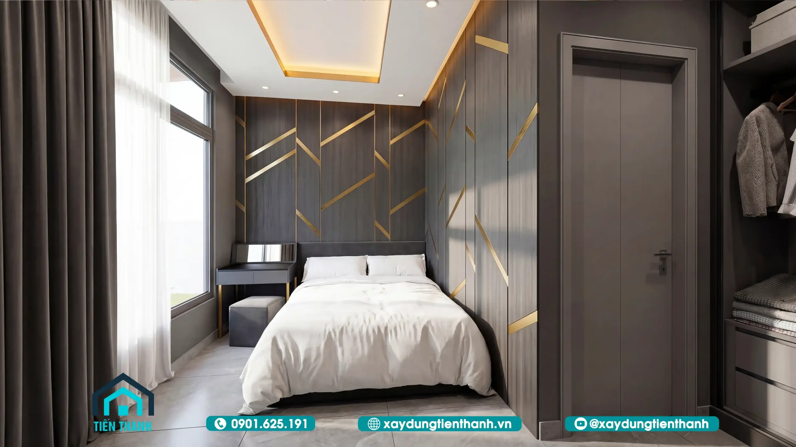 Phòng ngủ hiện đại với mảng tường đầu giường ốp gỗ trang trí đường chỉ vàng.
