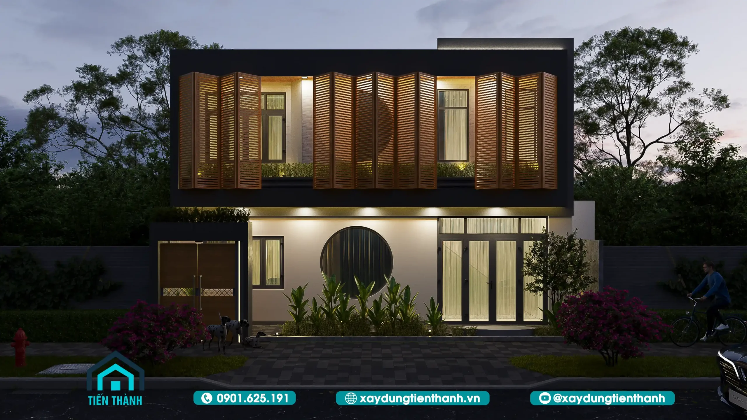 Phối cảnh mặt tiền nhà gác lửng 7x10m hiện đại với hệ lam gỗ chắn nắng độc đáo.