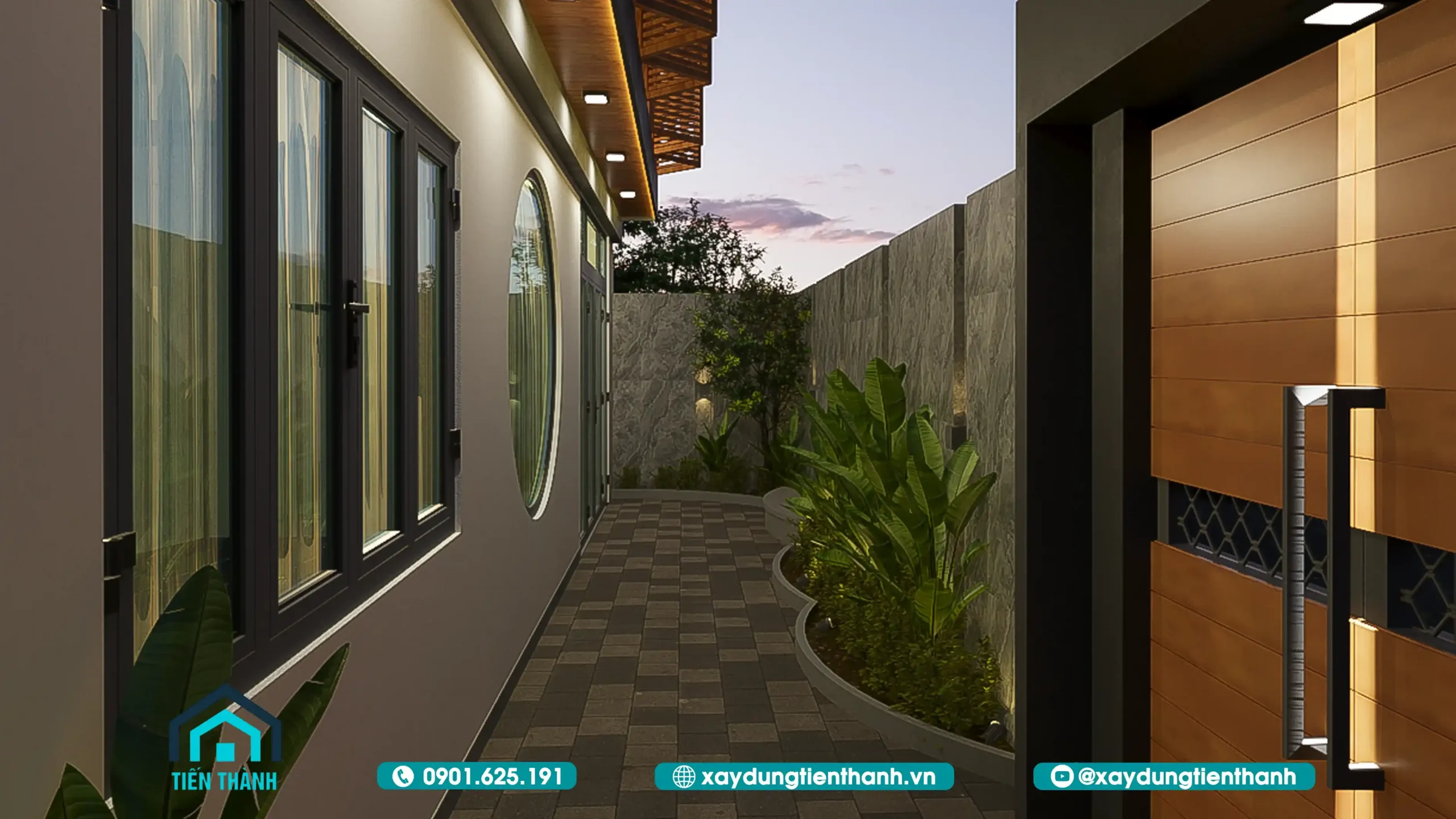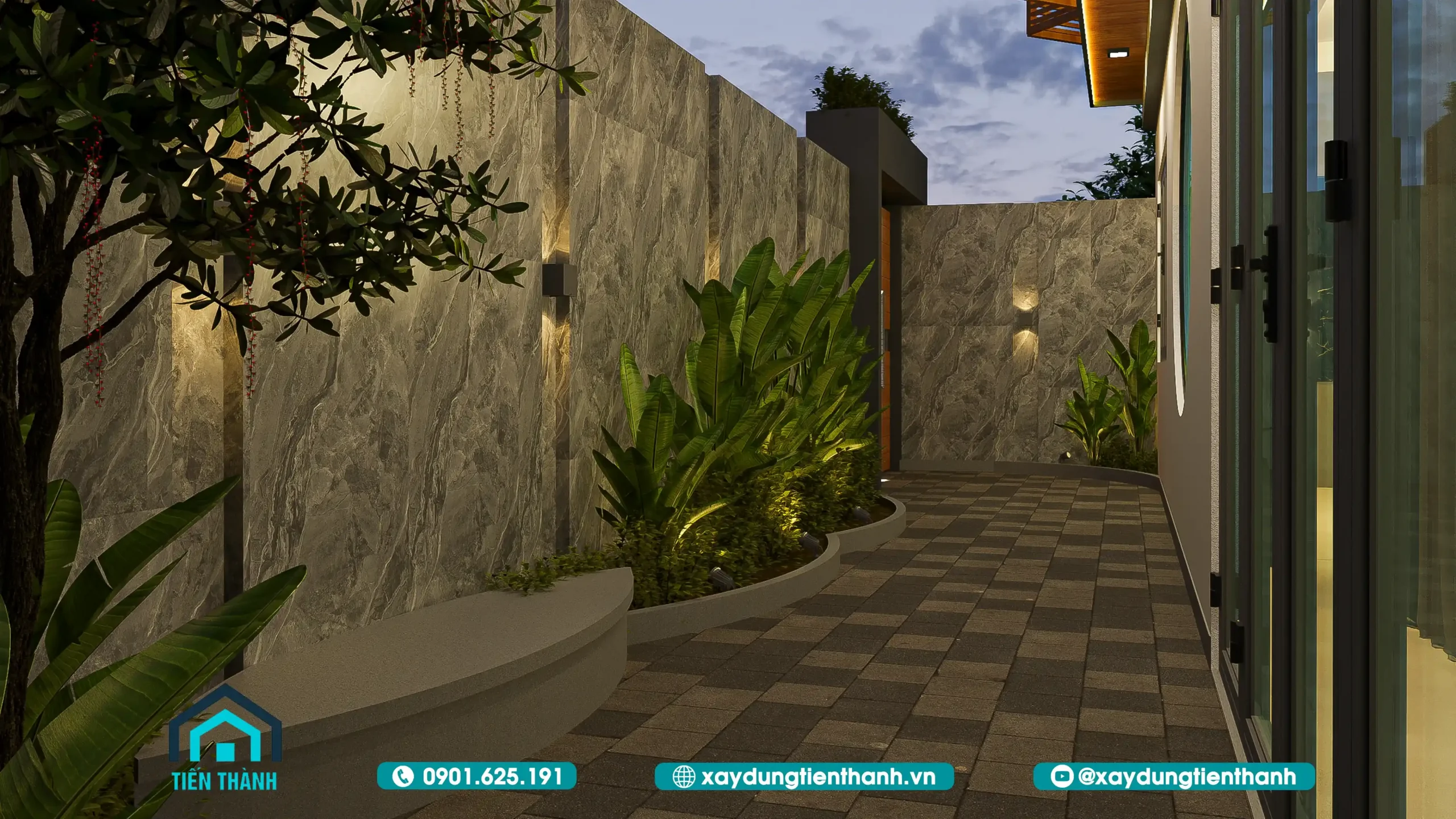 Phần sân vườn này chạy dọc theo chiều dài 10m của ngôi nhà, đóng vai trò như một “lá phổi xanh” cung cấp không khí trong lành. Việc sử dụng gạch lát sân dạng caro xám tối vừa mang lại cảm giác sạch sẽ, vừa tạo sự tương phản đẹp mắt với các khóm cây xanh.