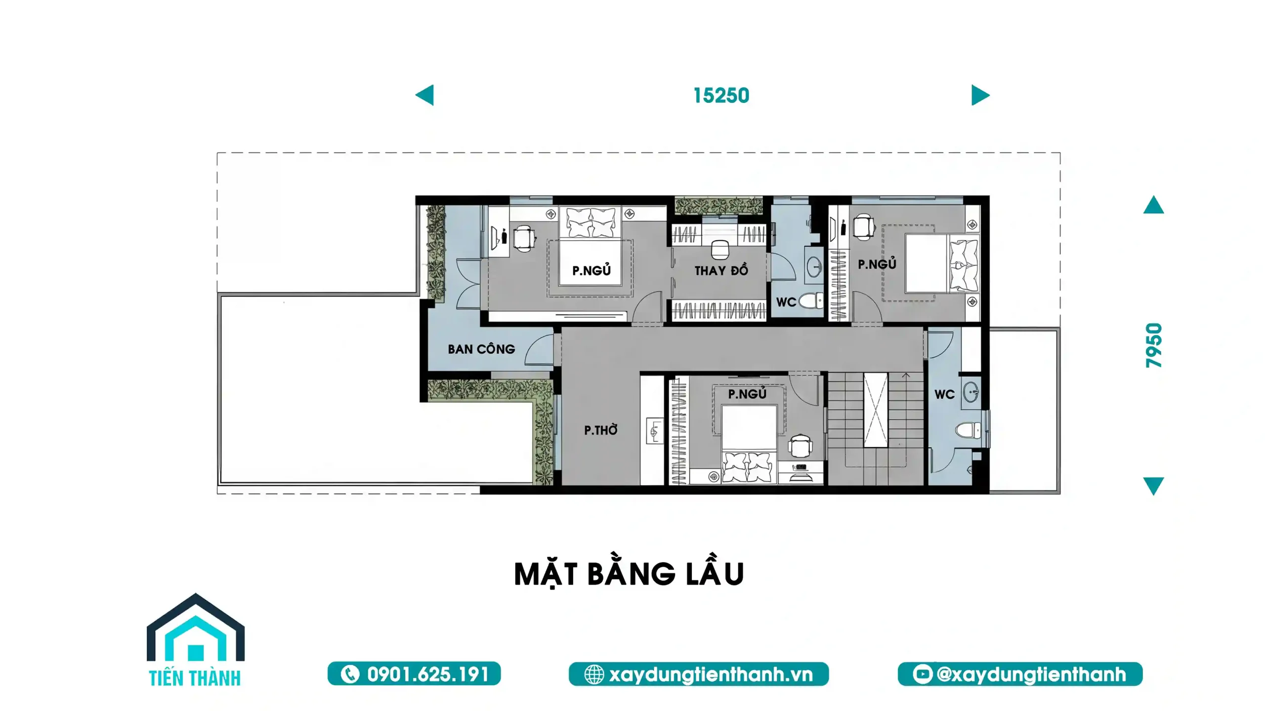Theo bản vẽ kỹ thuật, tầng lầu được bố trí 3 phòng ngủ (P.NGỦ). Điểm đặc biệt của những ngôi nhà có mặt tiền rộng là mọi phòng ngủ đều có thể tiếp cận với ánh sáng tự nhiên.