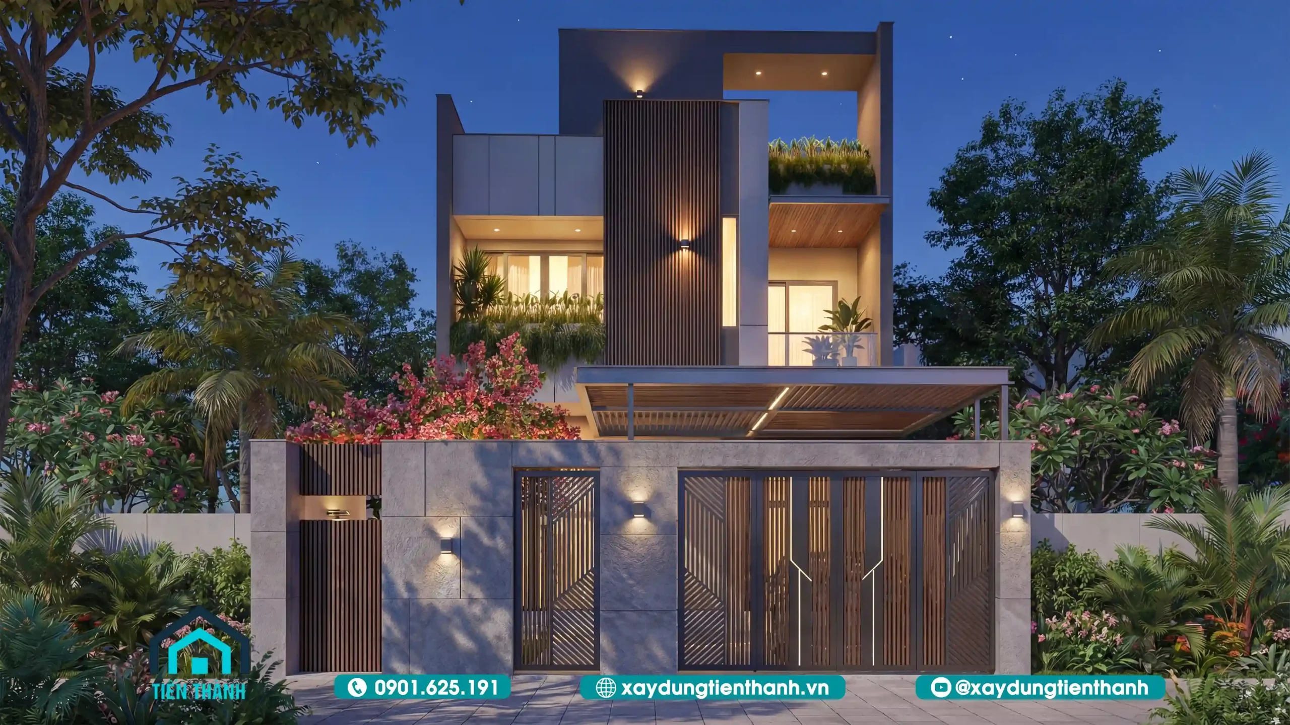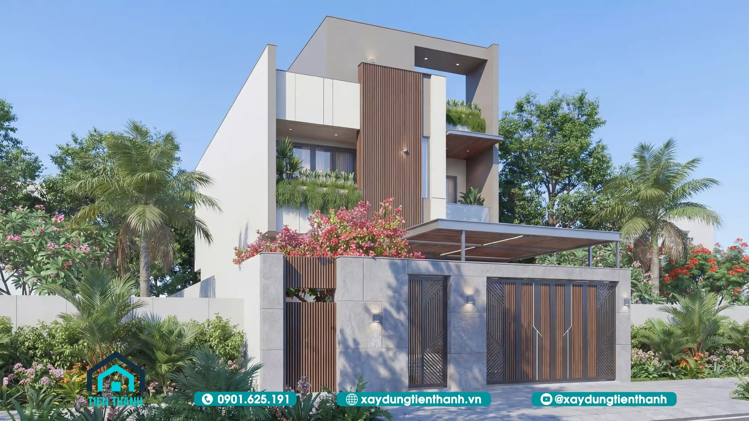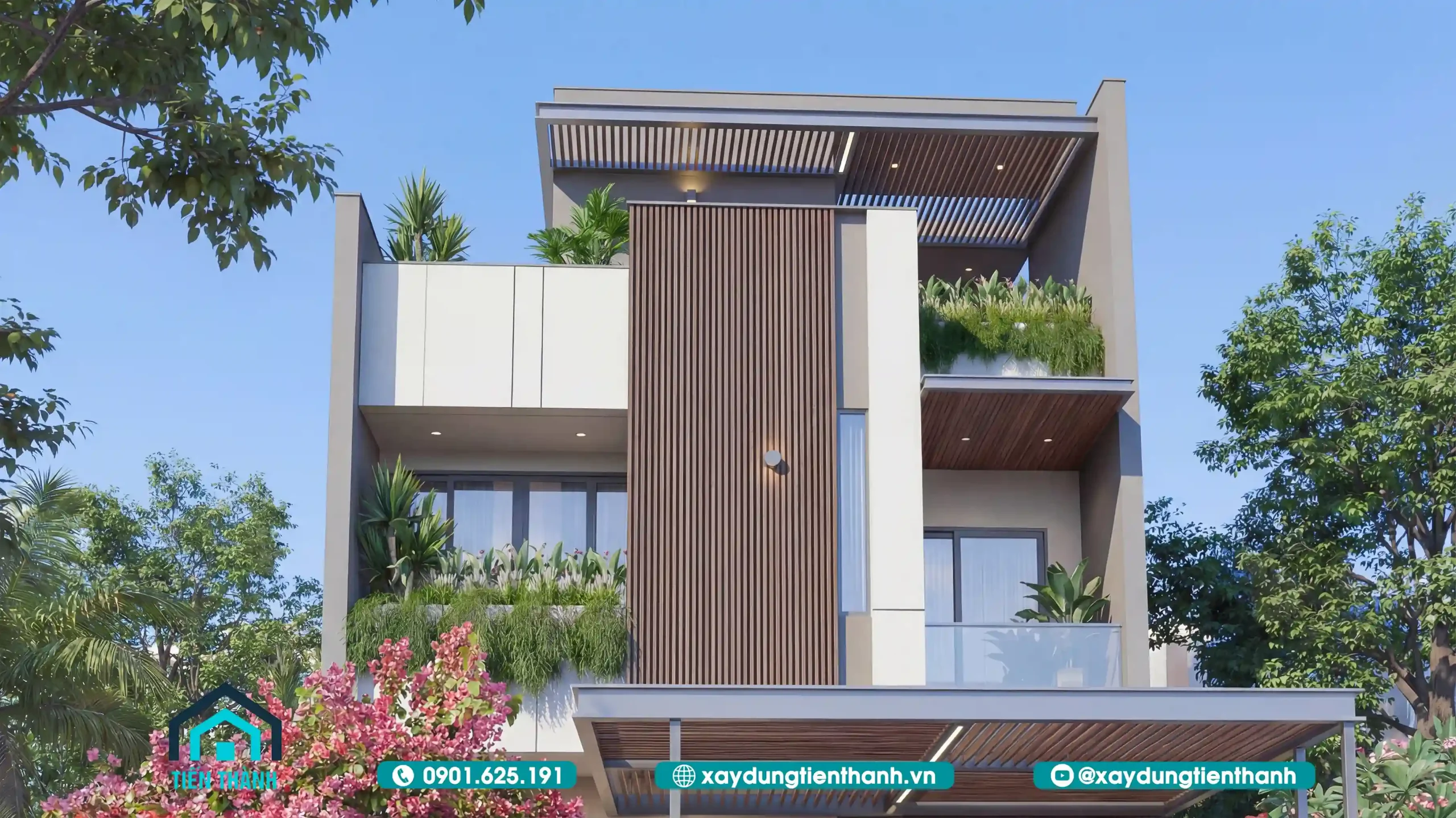 Mặt tiền rộng thường đi kèm với việc tiếp nhận nhiều bức xạ nhiệt. Giải pháp sử dụng lam gỗ (slats) không chỉ có tác dụng chắn nắng, điều hướng gió mà còn là điểm nhấn trang trí đắt giá. Việc tích hợp bồn hoa, cây xanh ở ban công giúp làm “mềm” đi các hình khối bê tông thô cứng.