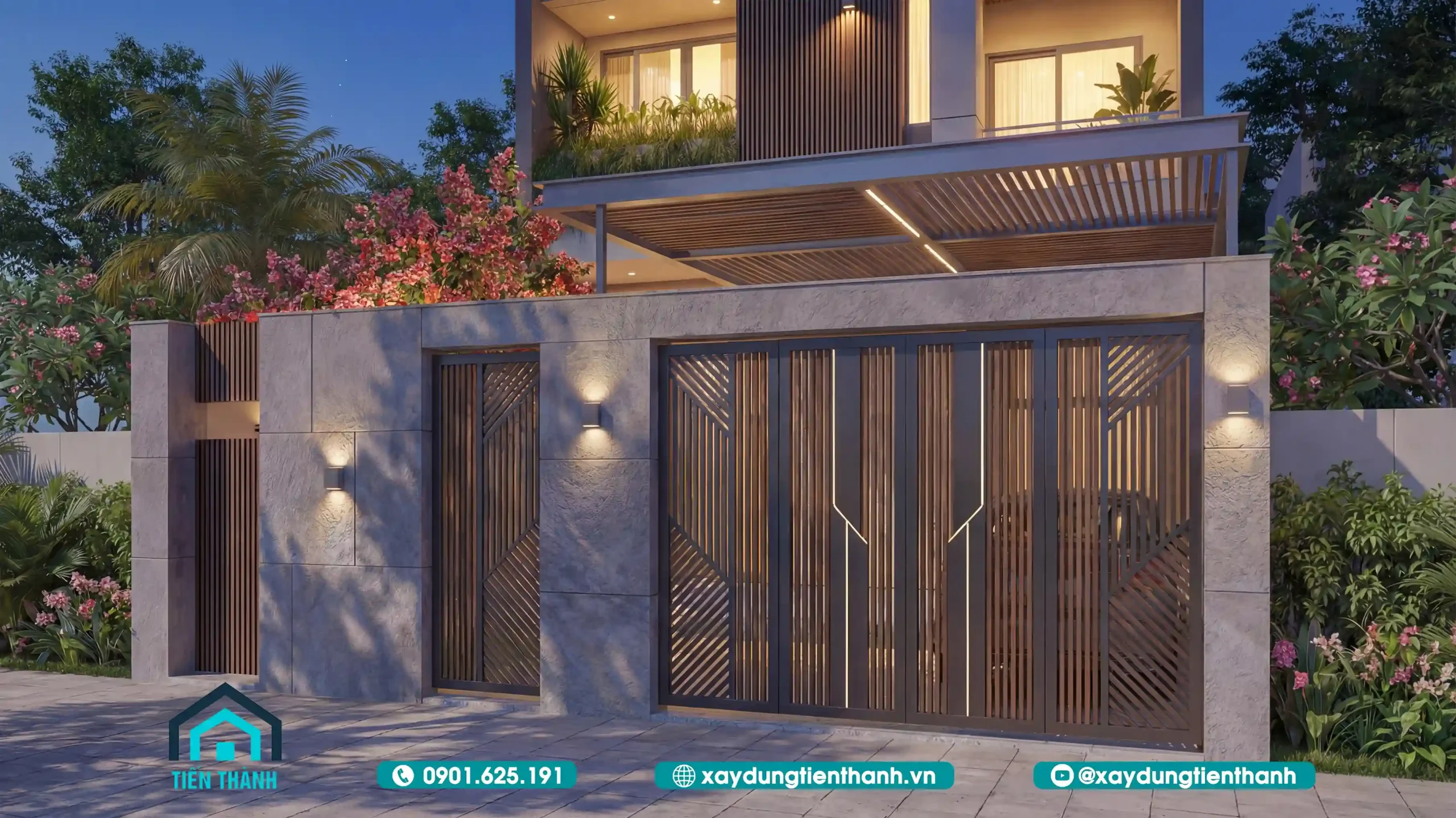 Với chiều ngang 9m, phần cổng không đơn thuần là lối đi mà là một tác phẩm nghệ thuật. Xu hướng hiện nay là sử dụng cổng sắt nan gỗ hoặc CNC với họa tiết tối giản.