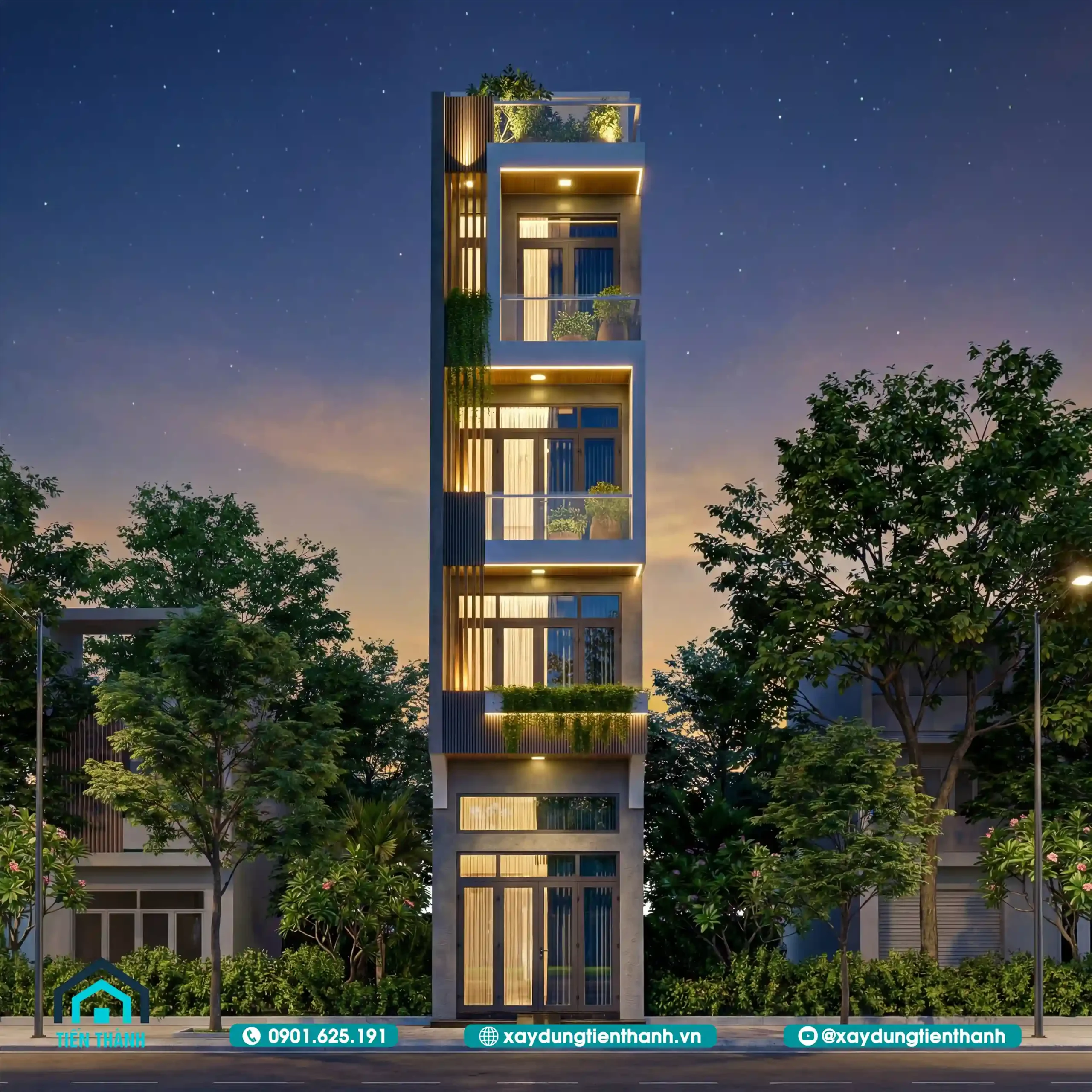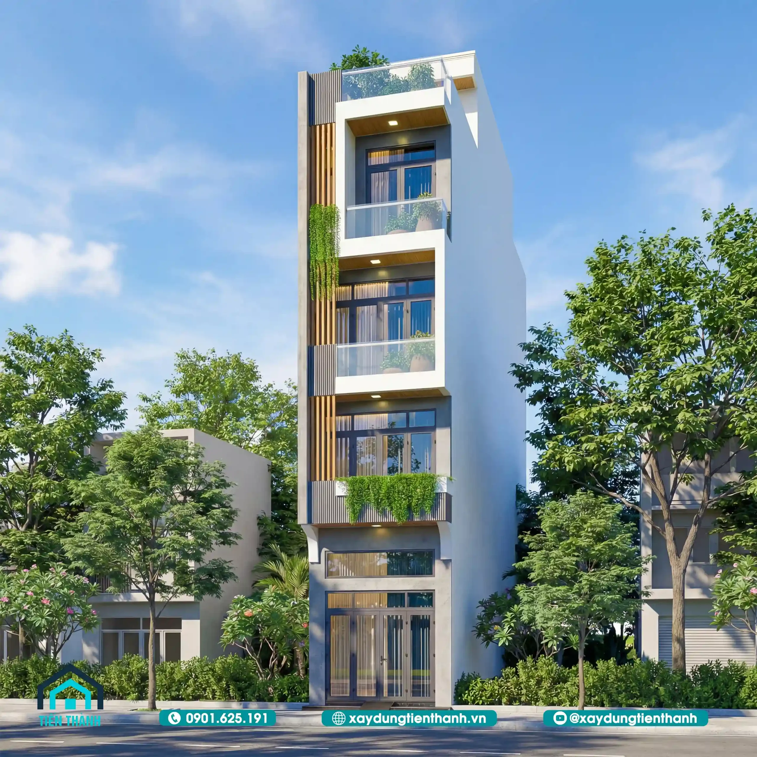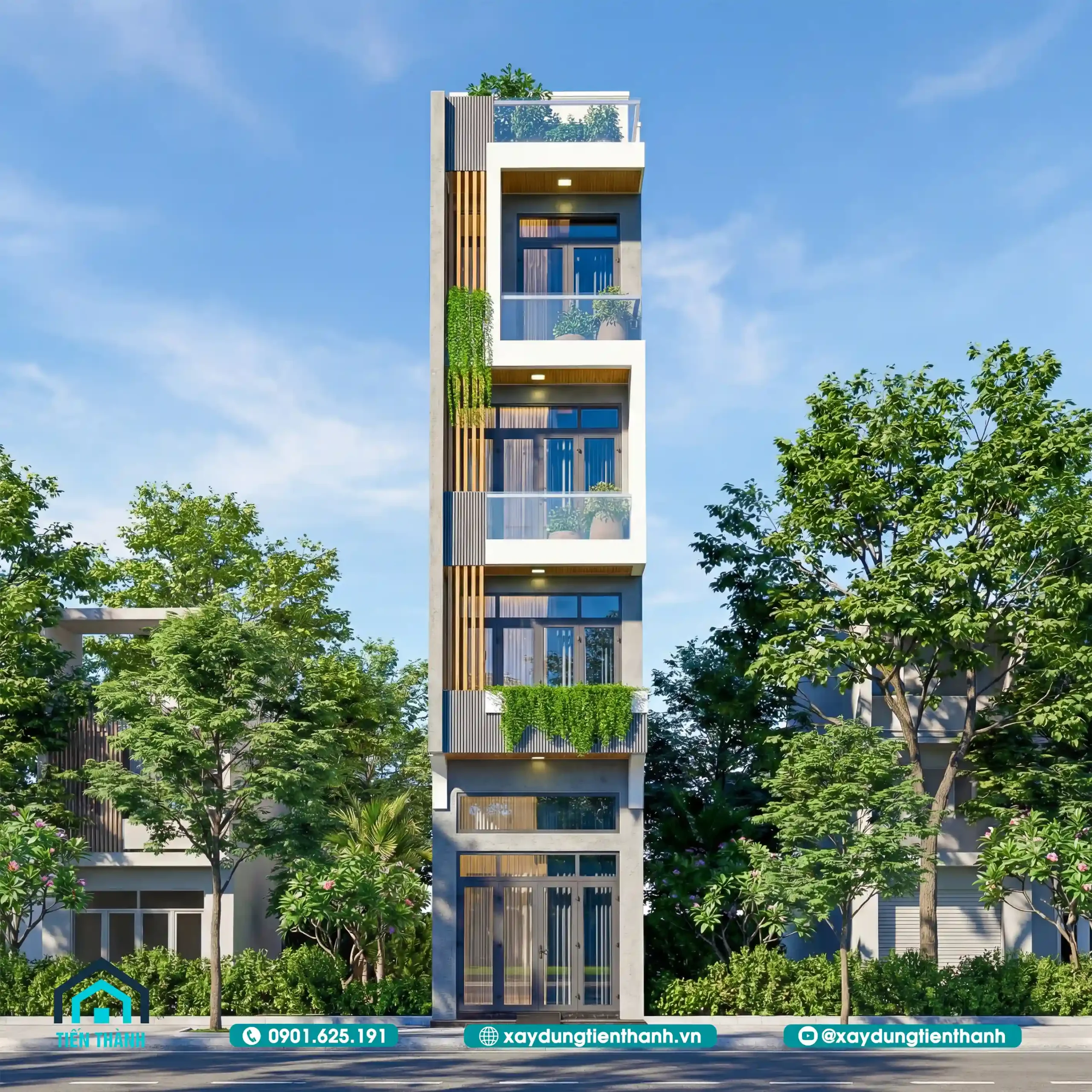 Phối cảnh mặt tiền nhà ống 5 tầng phong cách hiện đại với mảng xanh tươi mát.