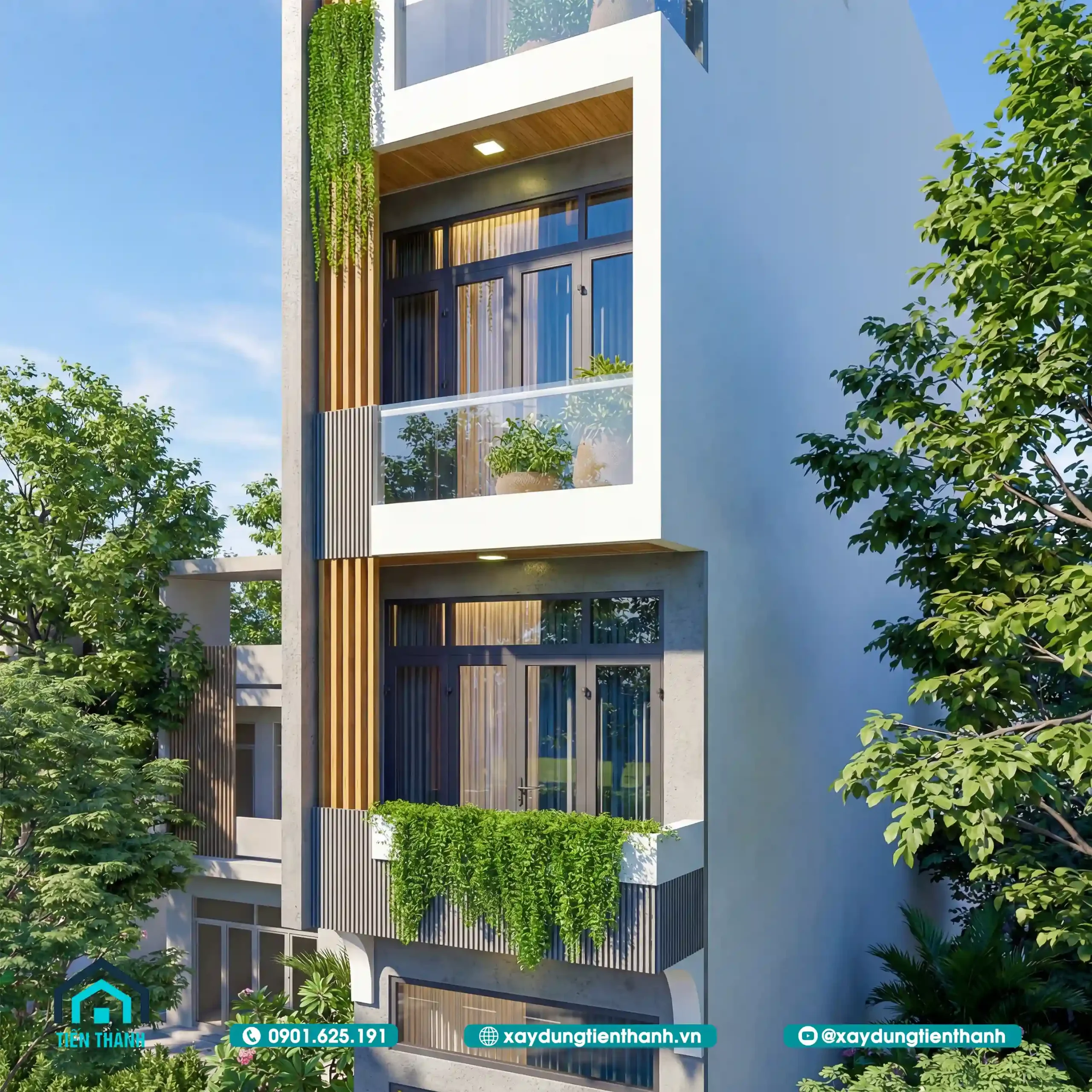 Phối cảnh nhà phố 5 tầng hiện đại, mặt tiền 3m với mảng xanh ban công đẹp.