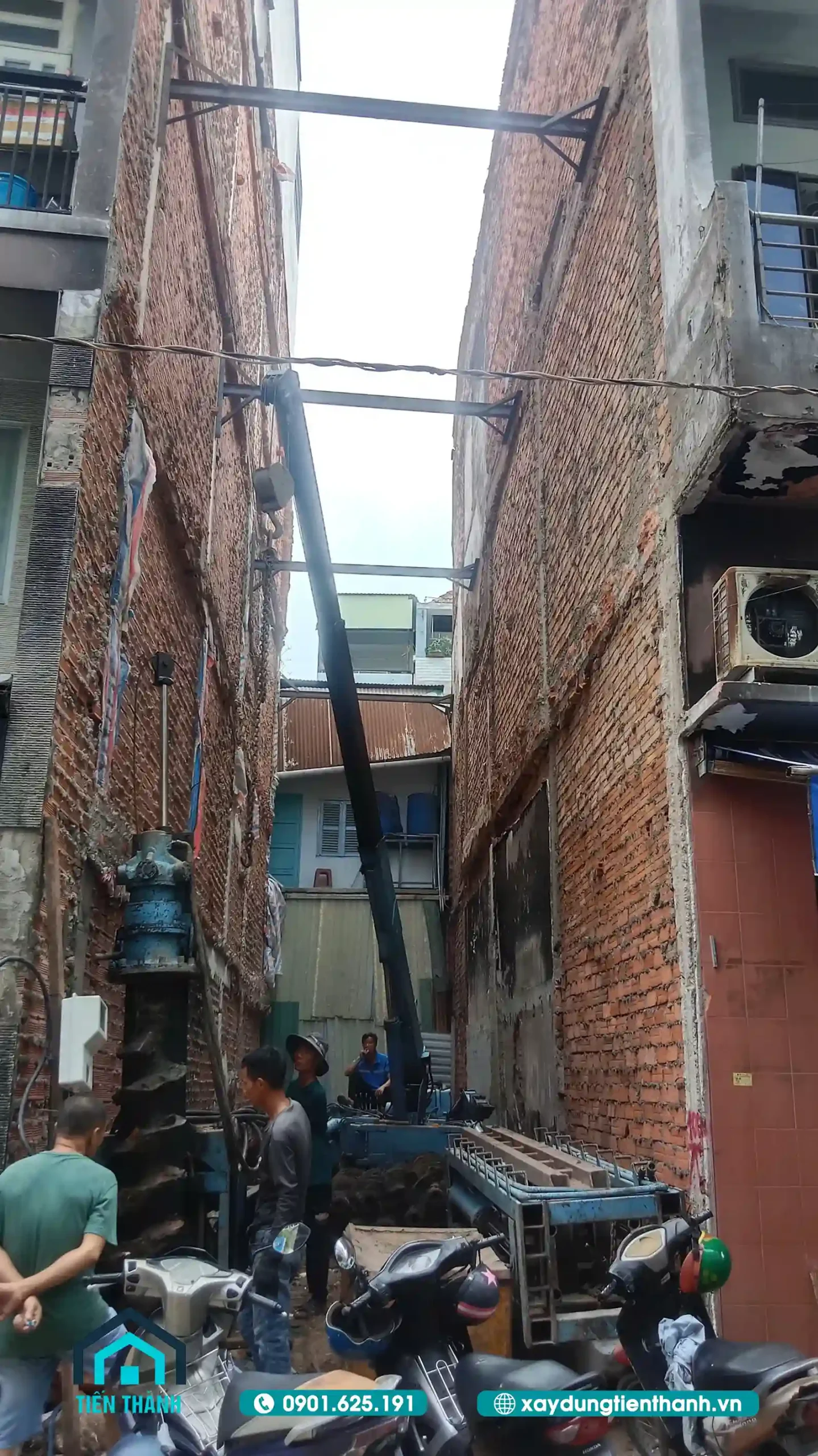 Công nhân đang thi công ép cọc móng trong con hẻm nhỏ hẹp giữa hai nhà.