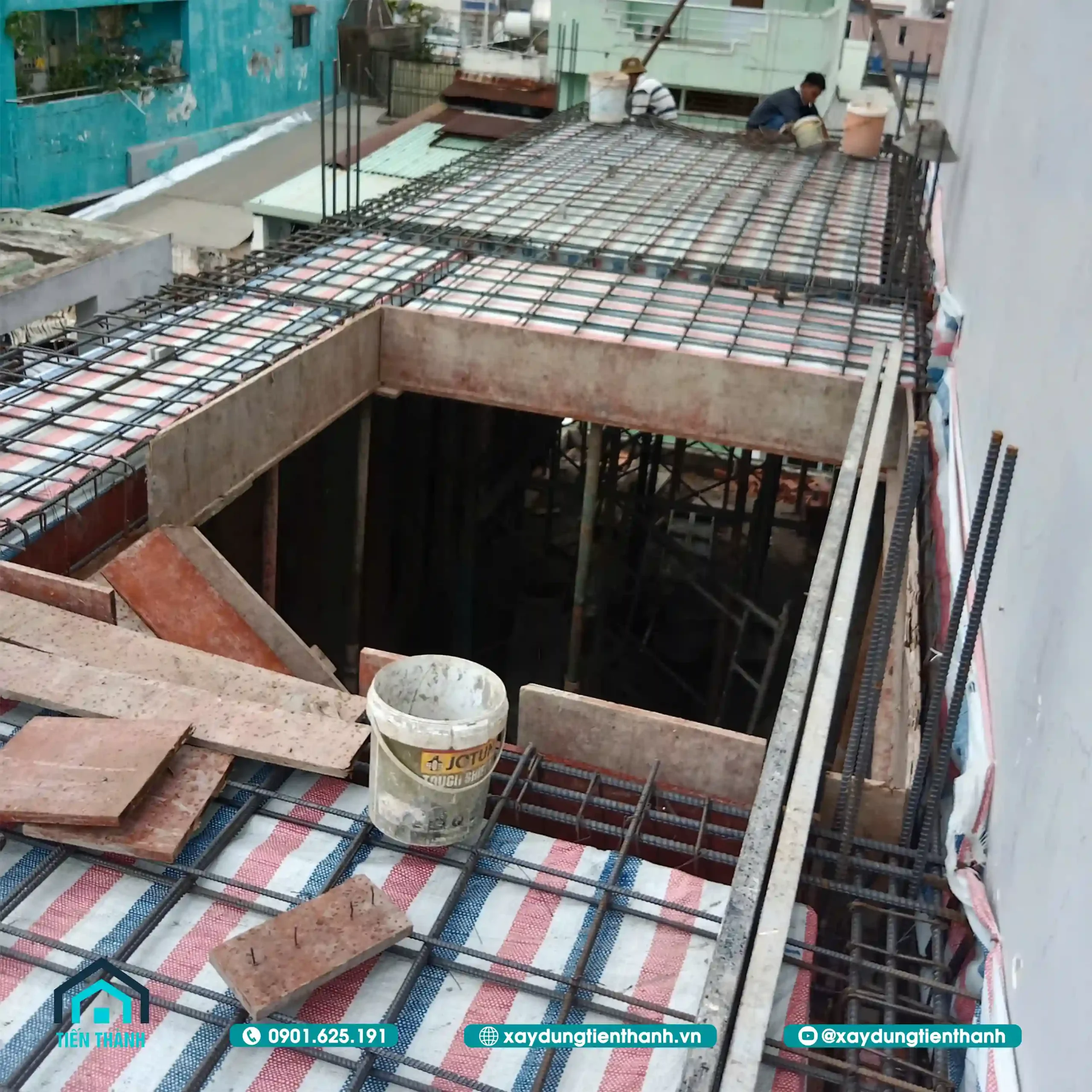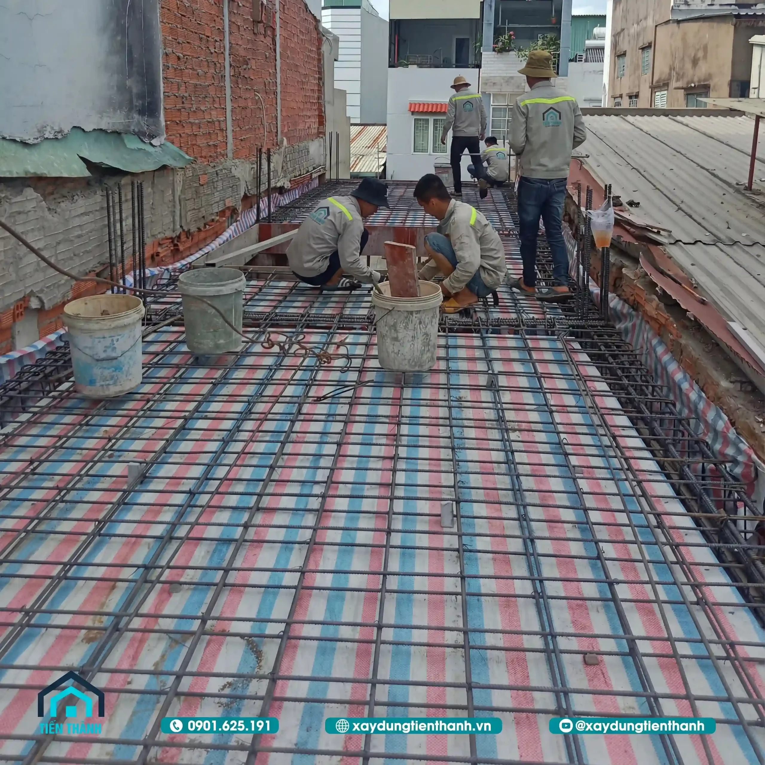 Công nhân đang thi công lắp đặt cốt thép sàn và hệ thống dầm cho nhà phố.
