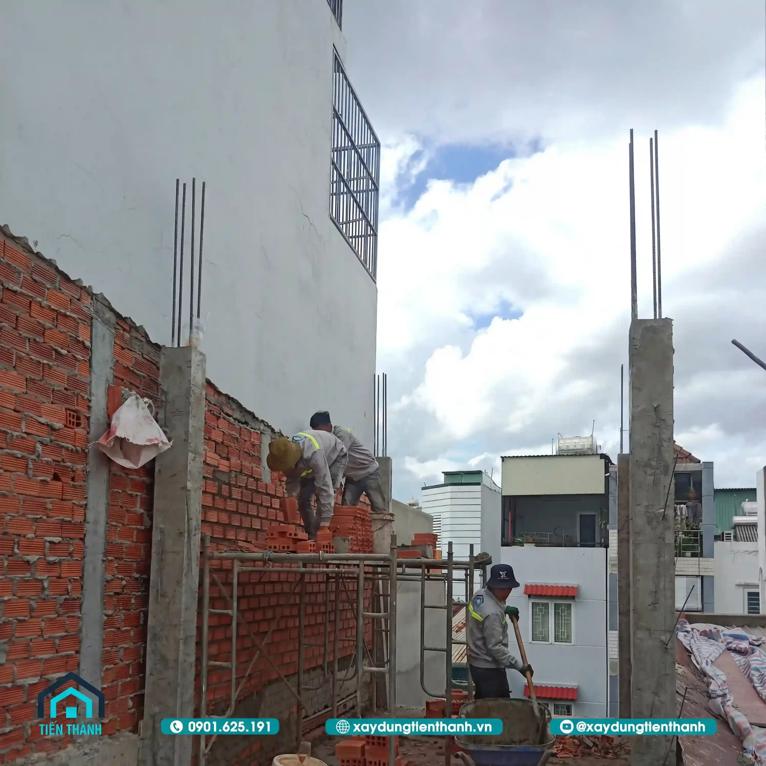 Đội ngũ thợ thi công xây tường gạch đúng kỹ thuật cho nhà phố 5 tầng.