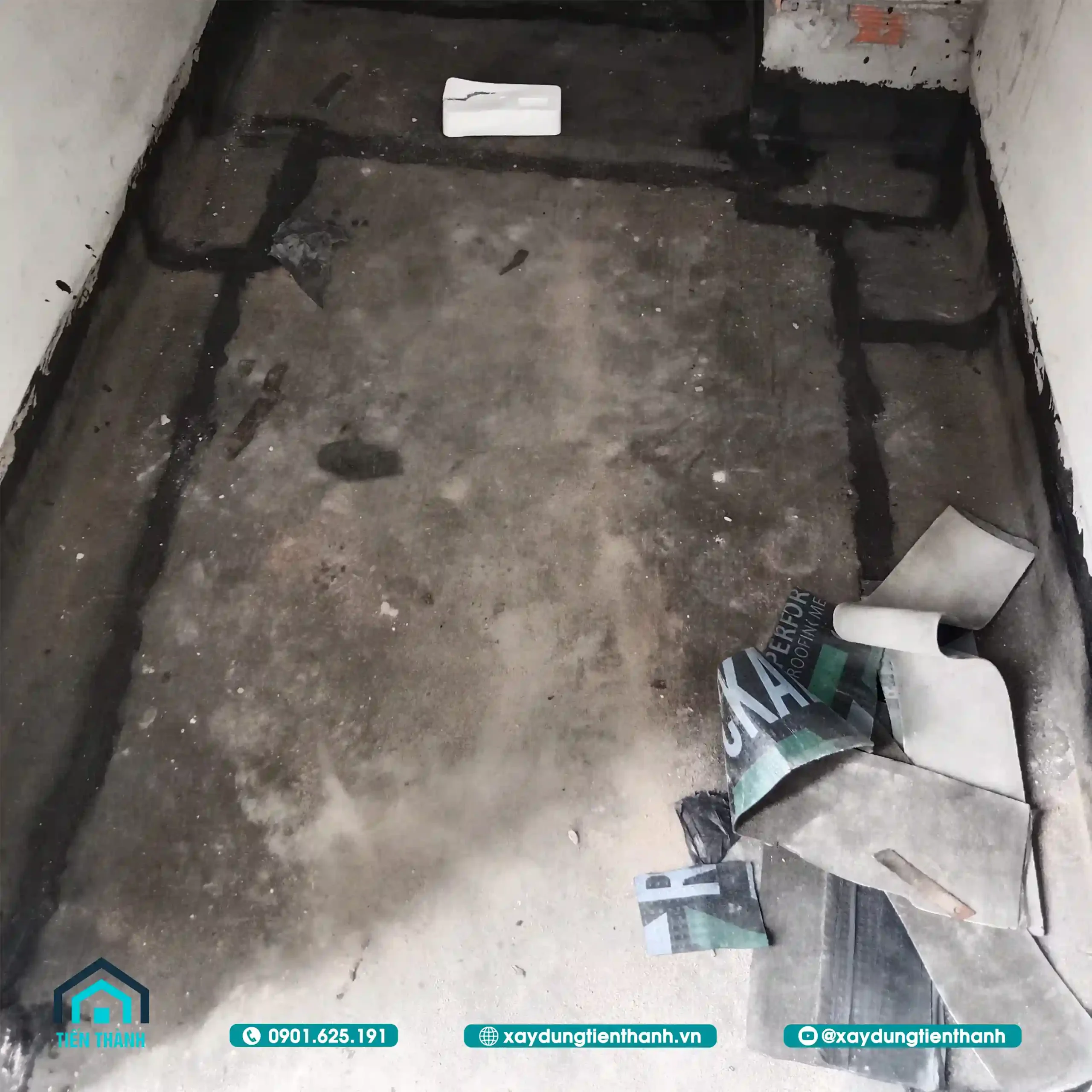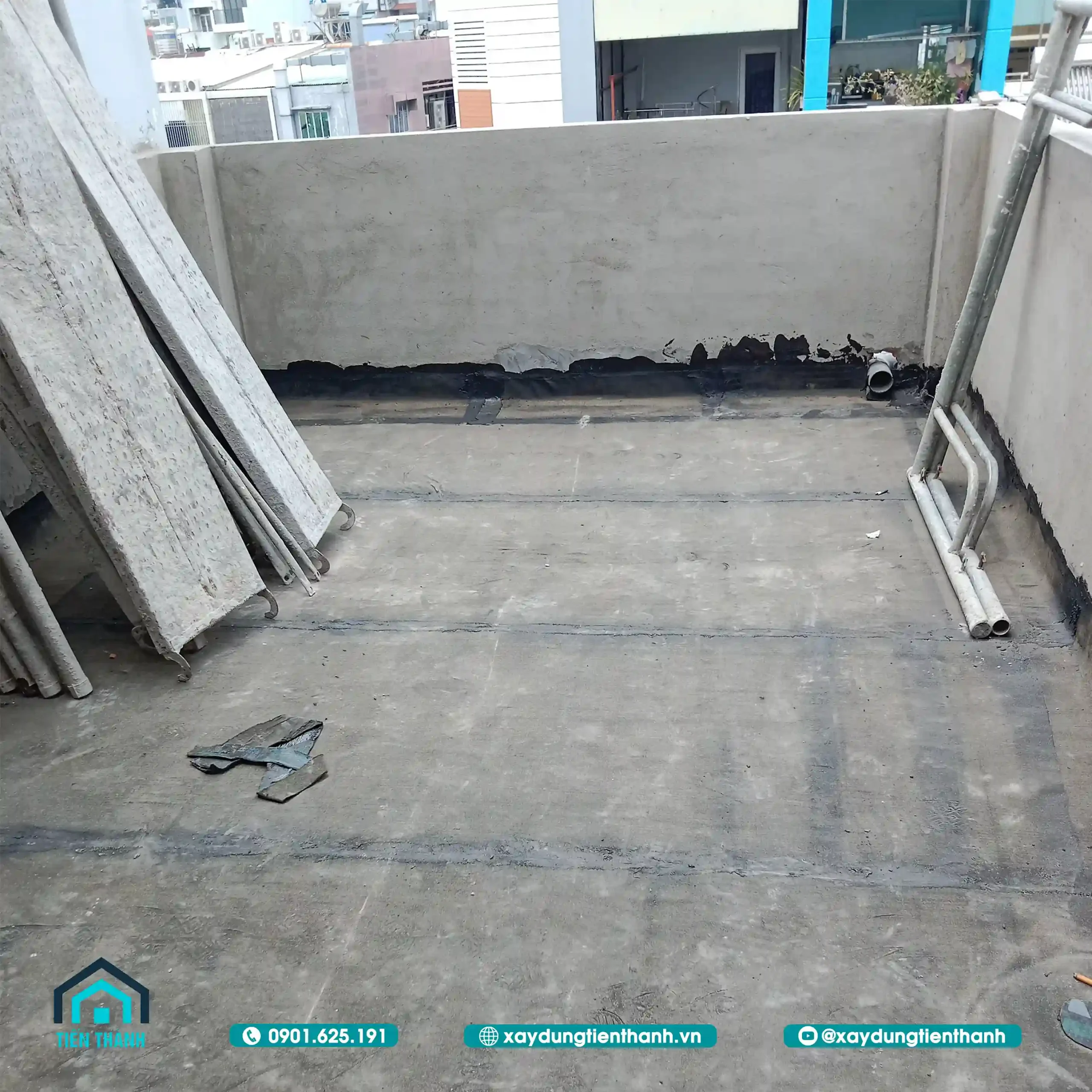 Sân thượng đã hoàn thành lớp lót chống thấm và chuẩn bị cho các bước thi công tiếp.