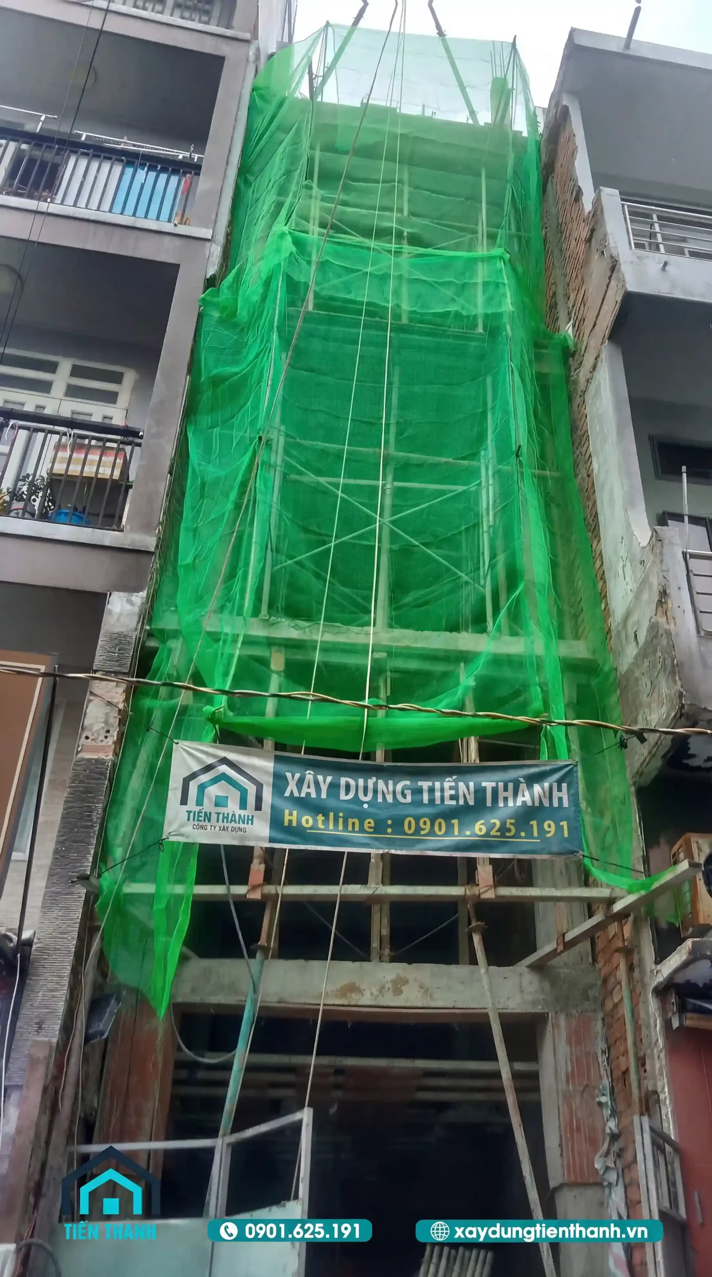 Để đảm bảo an toàn lao động và không ảnh hưởng đến các hộ xung quanh, toàn bộ mặt tiền công trình được bao che bằng lưới chuyên dụng. Đây là minh chứng cho quy trình làm việc bài bản của đơn vị thi công uy tín.