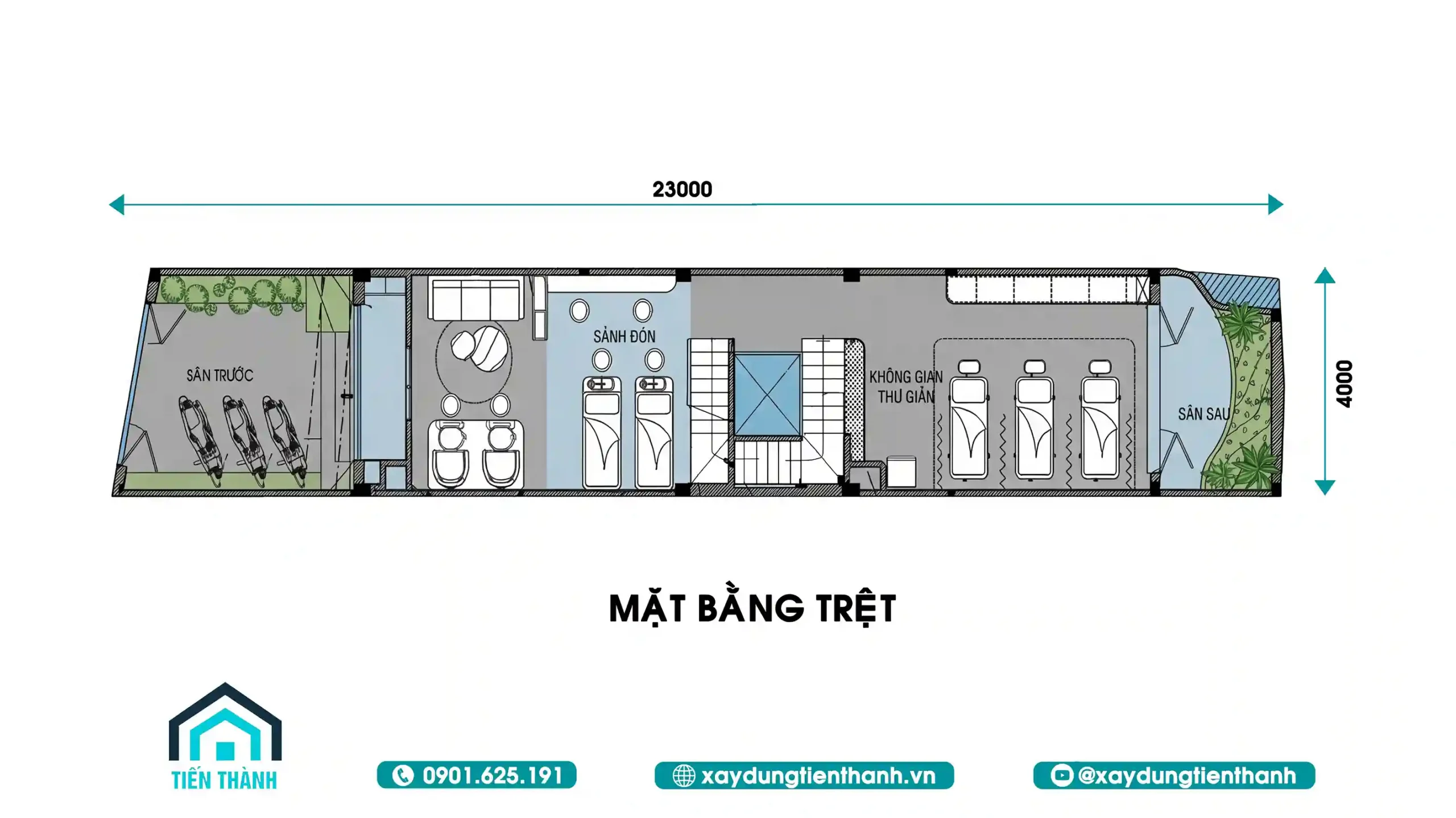 Với diện tích chiều dài ấn tượng (23m), tầng trệt của mẫu nhà ống 4 tầng hiện đại này được tính toán kỹ lưỡng để phục vụ nhiều mục đích khác nhau.