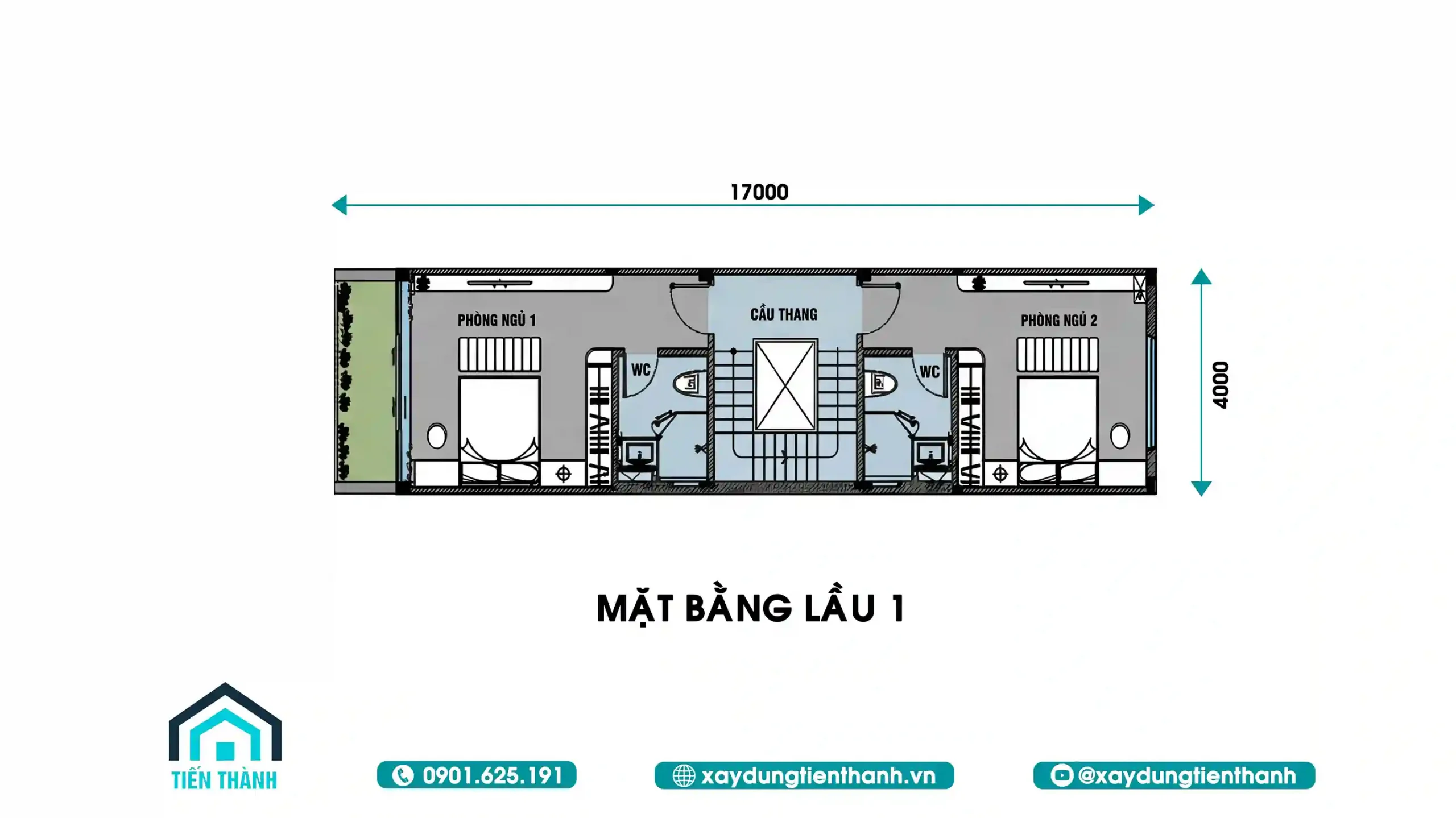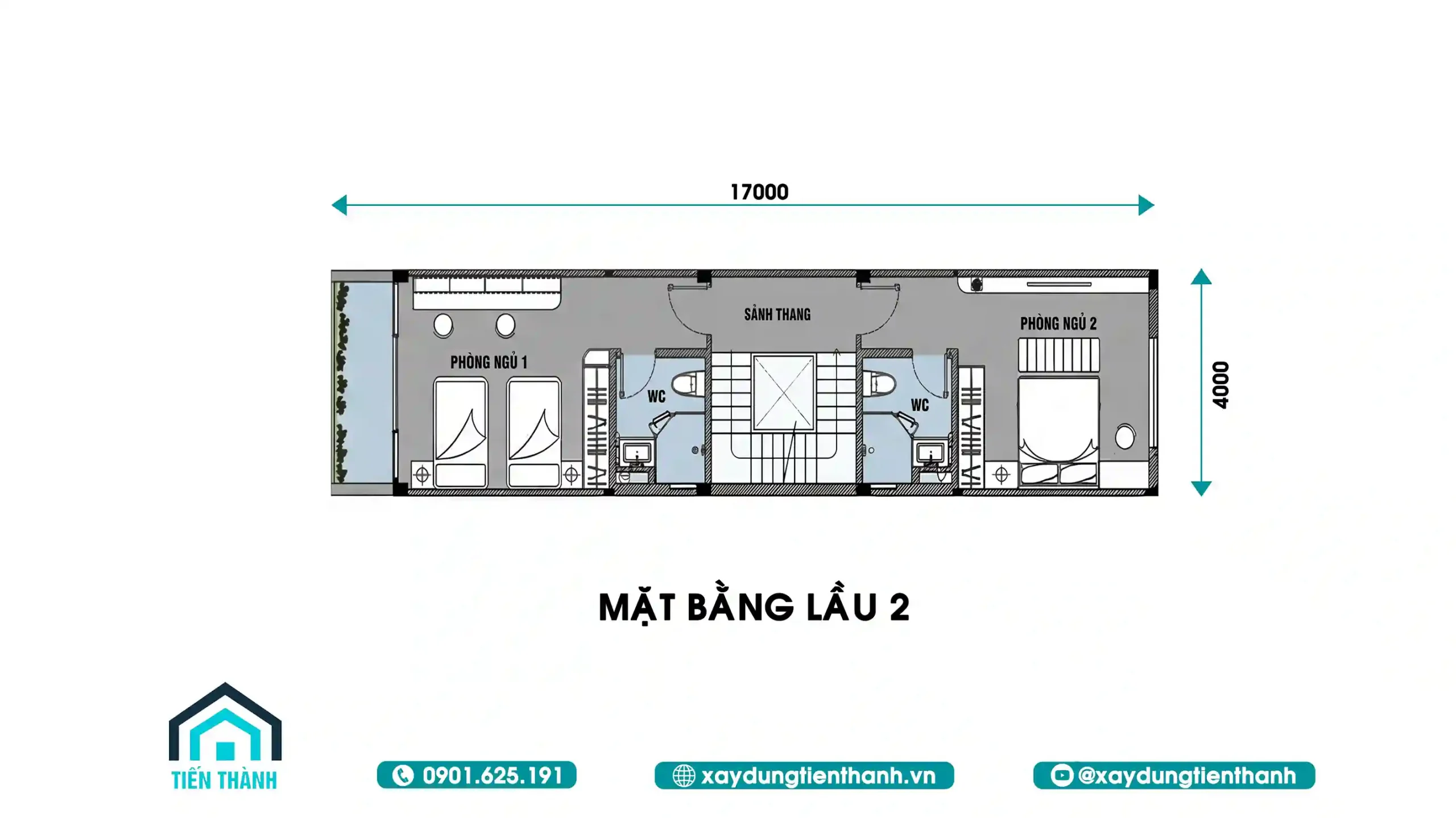 Tương tự như tầng 1, tầng 2 tiếp tục là không gian nghỉ ngơi. Tuy nhiên, cách bố trí nội thất có thể thay đổi để phù hợp với nhu cầu của con cái hoặc làm phòng ngủ cho khách. Sự đồng bộ trong việc đặt WC cạnh cầu thang giúp tiết kiệm diện tích và thuận tiện cho kỹ thuật lắp đặt ống nước.