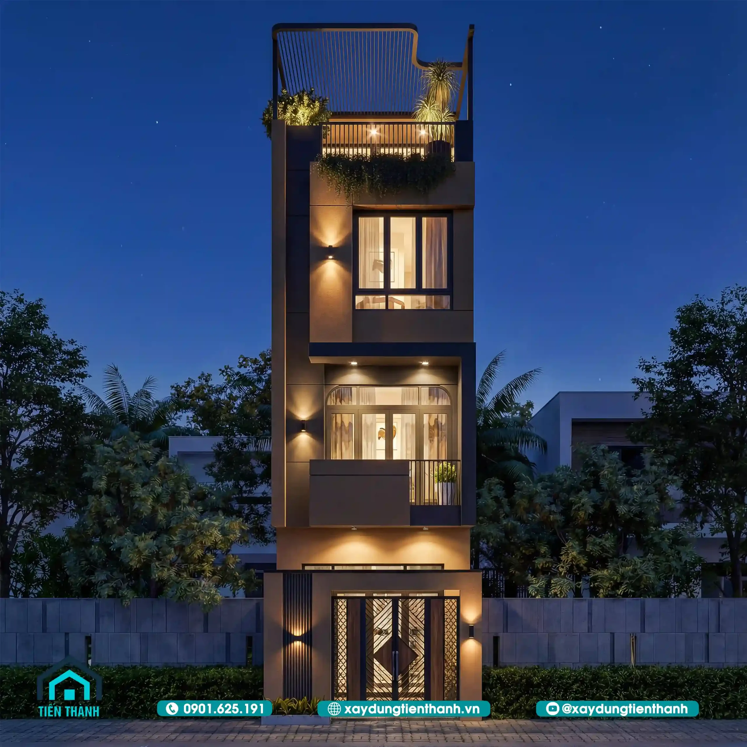 Ngoại thất nhà phố 4 tầng rực rỡ dưới ánh đèn đêm, tạo cảm giác ấm cúng và sang trọng.