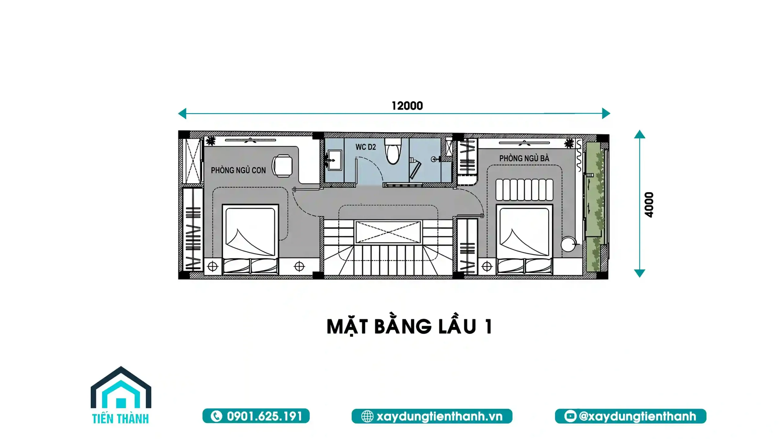 Mặt bằng lầu 1 bao gồm phòng ngủ cho con và phòng ngủ dành cho người lớn tuổi.