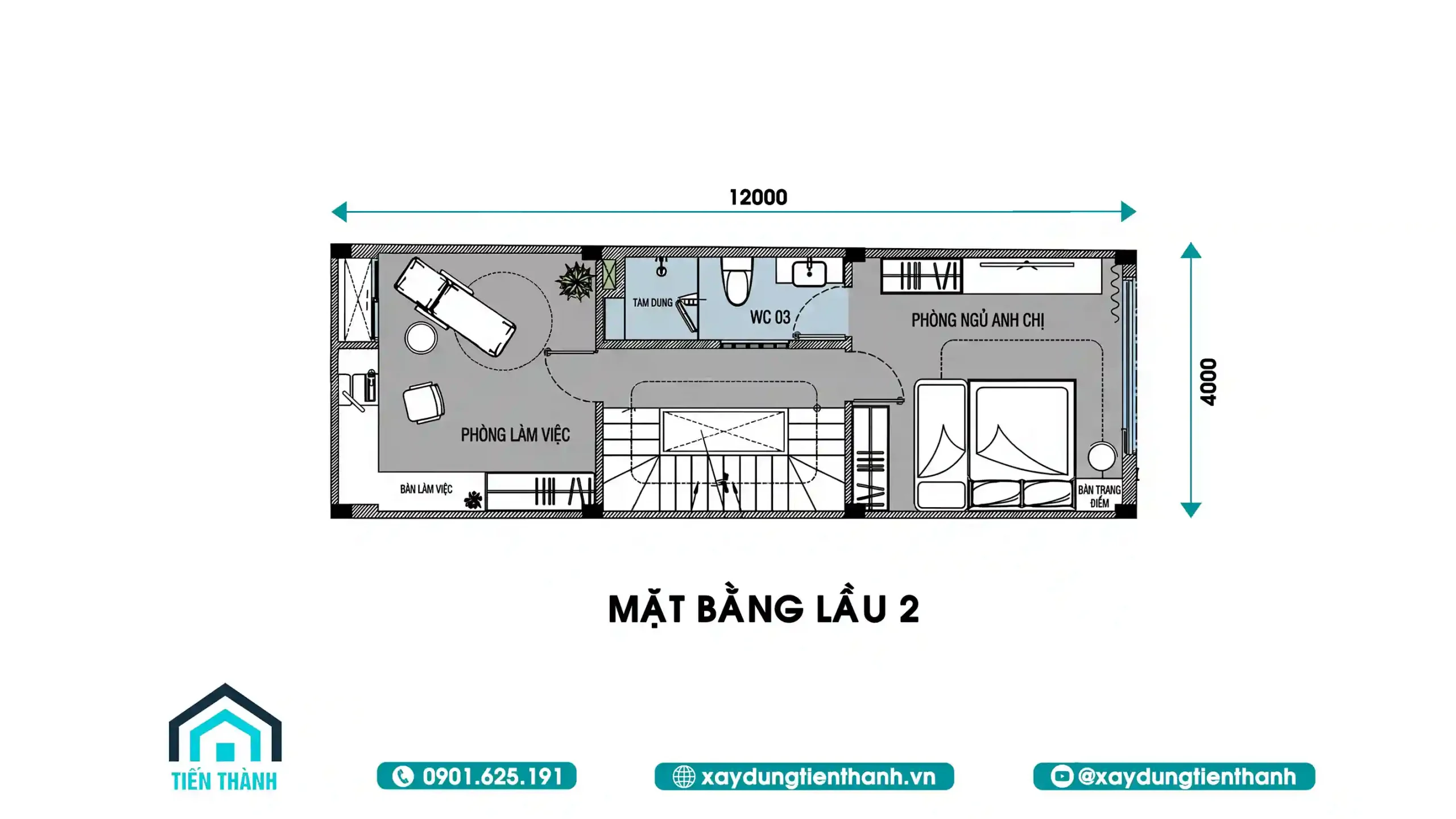 Thiết kế lầu 2 tối ưu công năng với phòng ngủ chính và phòng làm việc yên tĩnh.
