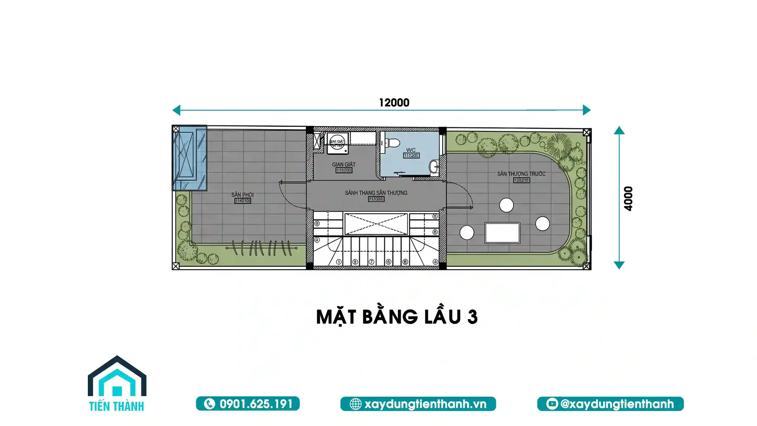 Mặt bằng lầu 3 phân chia khu vực sân thượng trước sau và phòng giặt đồ tiện lợi.