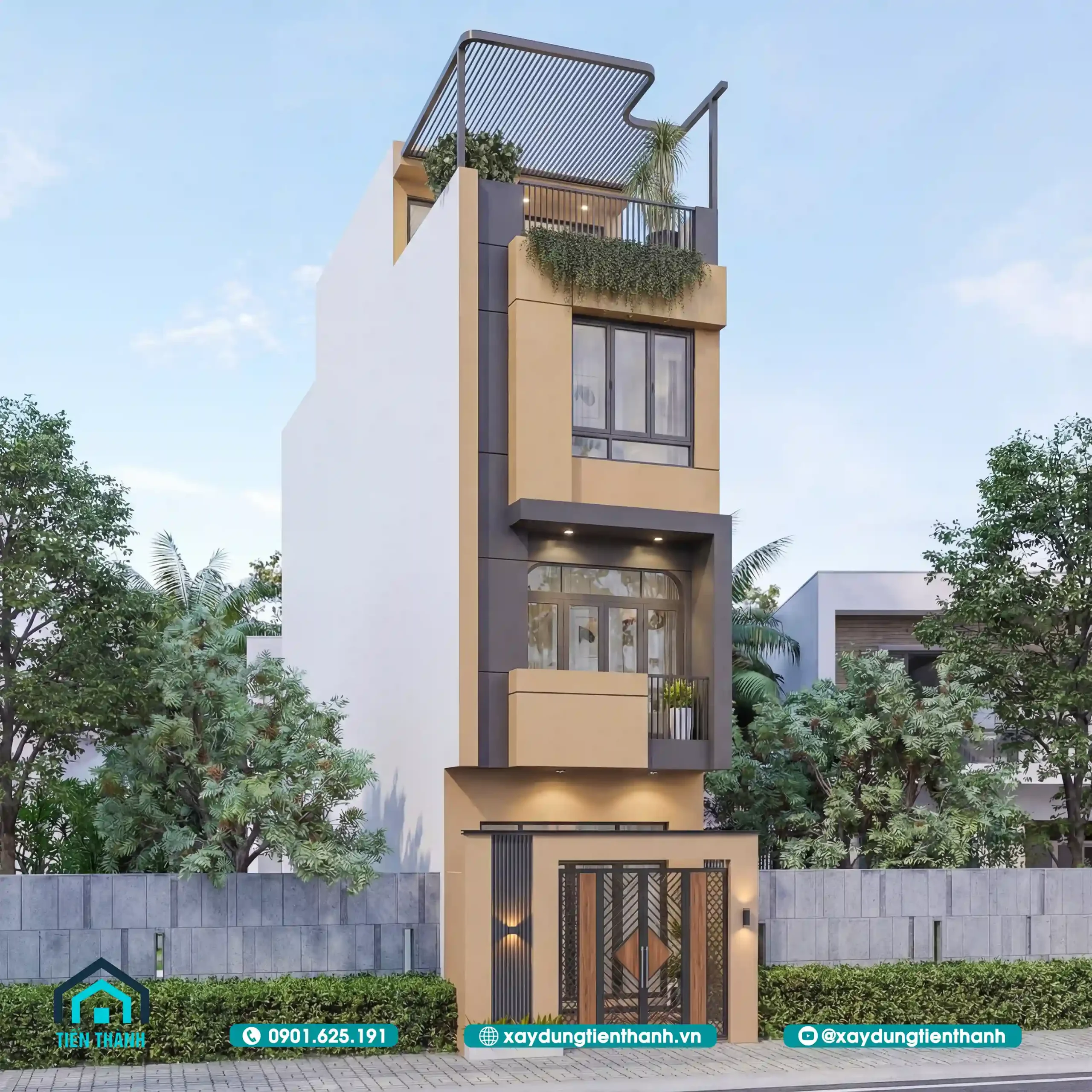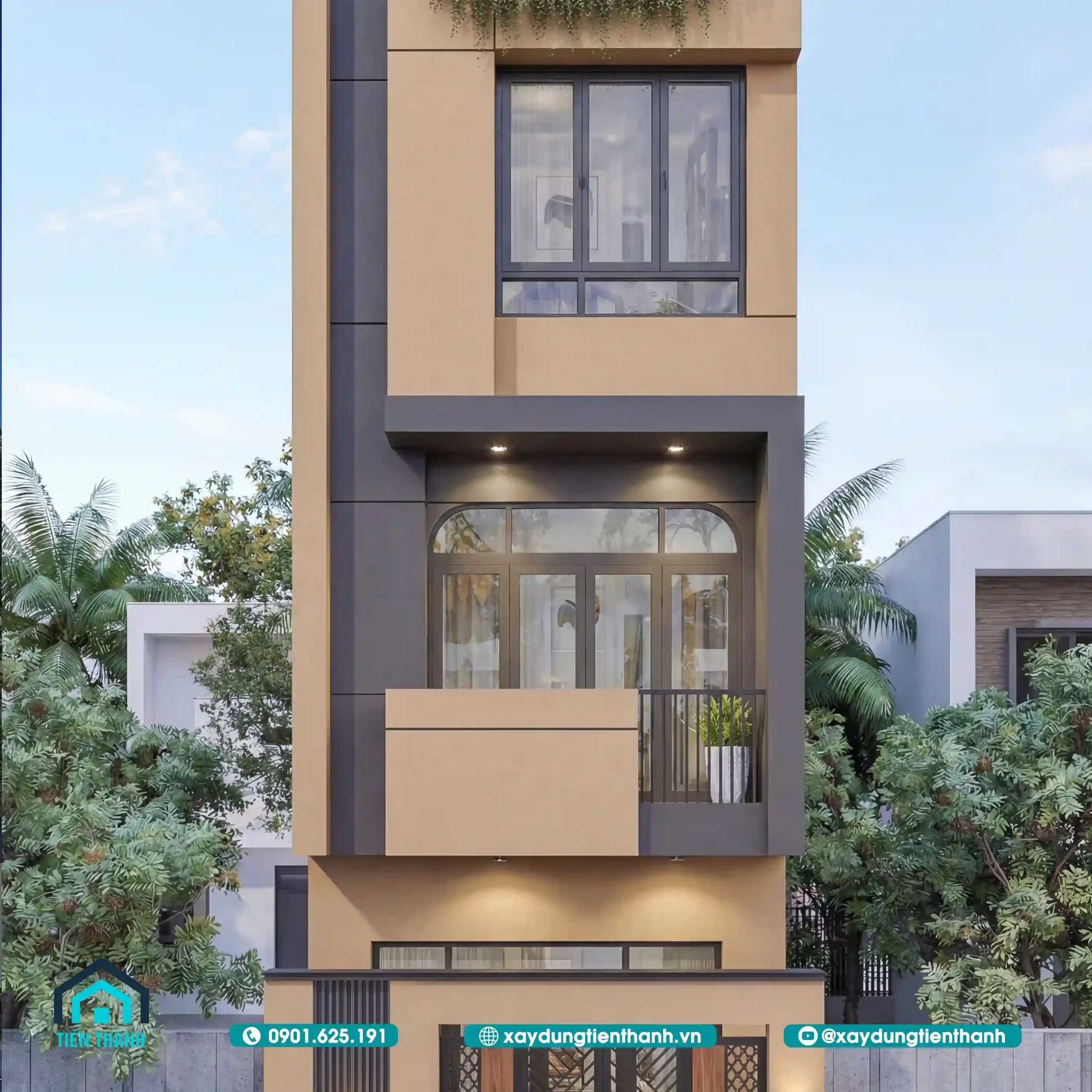 Góc nhìn tổng thể từ dưới lên cho thấy sự kiên cố và tinh tế của mẫu nhà 4 tầng.