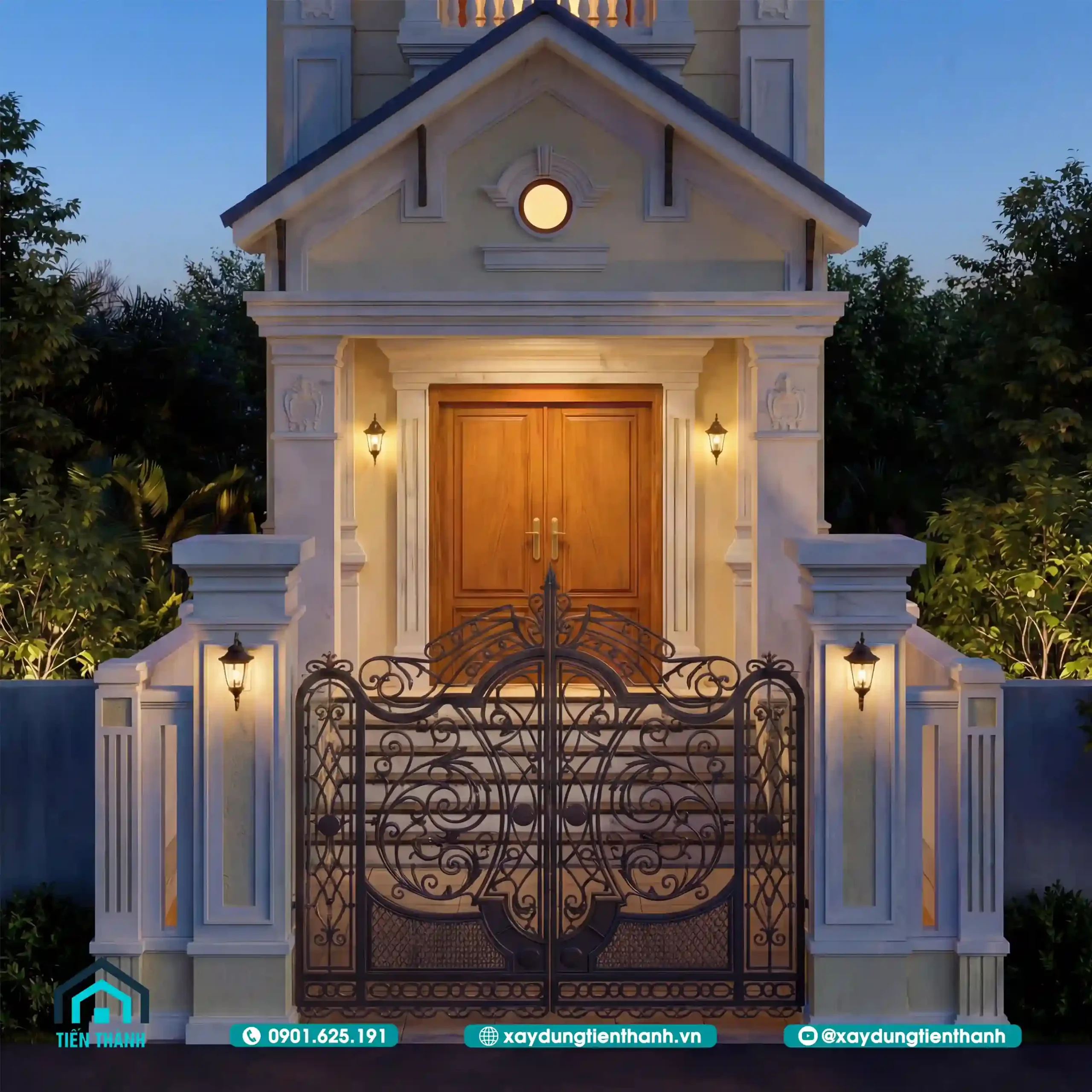 Trong thiết kế nhà 2 tầng tân cổ điển ngang 5m, việc phối hợp ánh sáng đóng vai trò quan trọng trong việc tạo ra vẻ lung linh vào ban đêm. Hệ thống đèn tường cổ điển được bố trí đối xứng tại cổng, sảnh chính và ban công, tỏa ra ánh sáng vàng ấm áp, tôn lên các chi tiết điêu khắc trên tường.