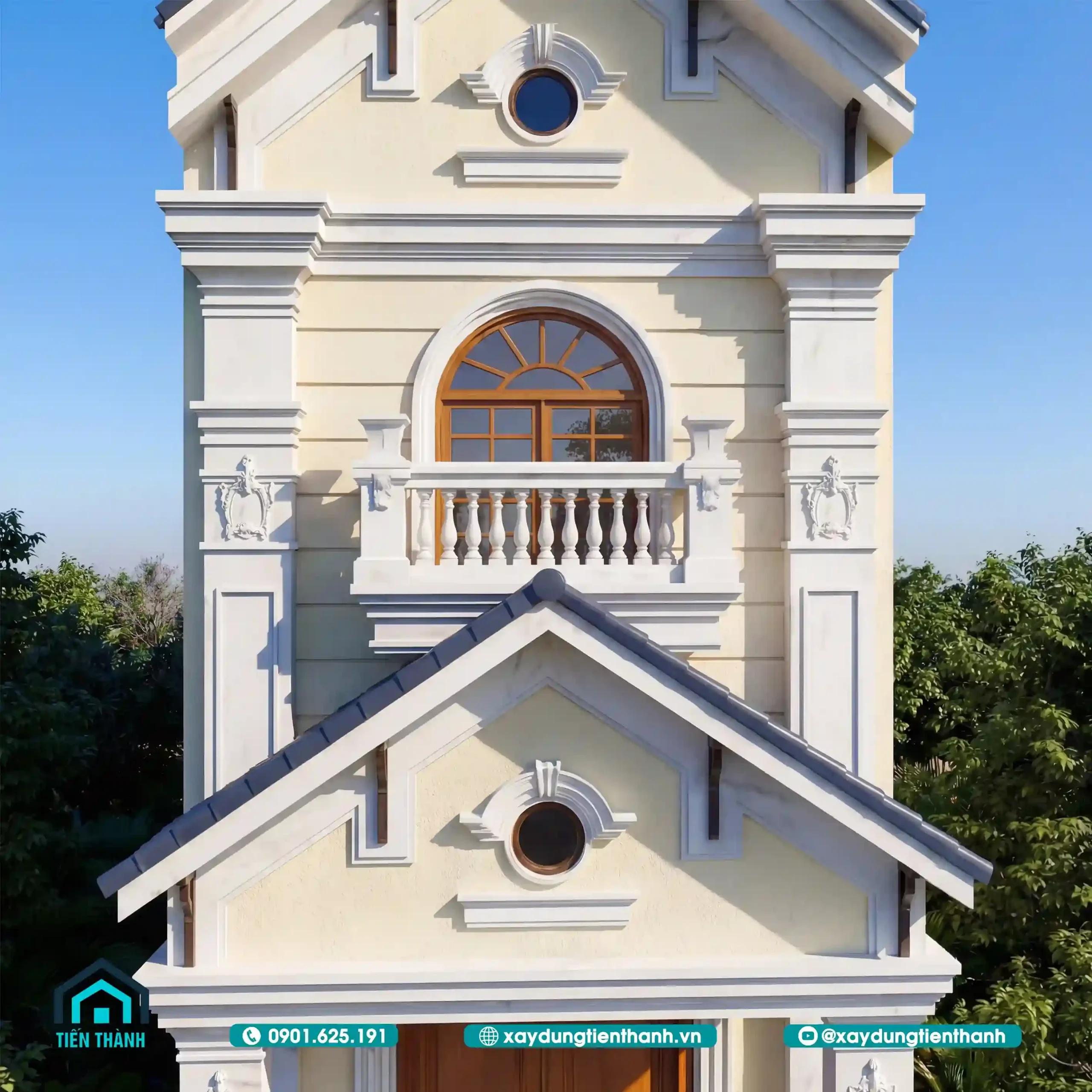 Điểm nhấn đầu tiên của mẫu nhà 2 tầng tân cổ điển ngang 5m này chính là hệ mái Thái chữ A xếp lớp. Sự phân tầng của mái không chỉ giúp thoát nước mưa tốt mà còn tạo cảm giác ngôi nhà cao ráo, thanh thoát hơn. Các ô cửa sổ tròn nhỏ tại khu vực đầu hồi mái được trang trí bằng phào chỉ nổi, tạo nên điểm nhìn độc đáo và cổ kính.