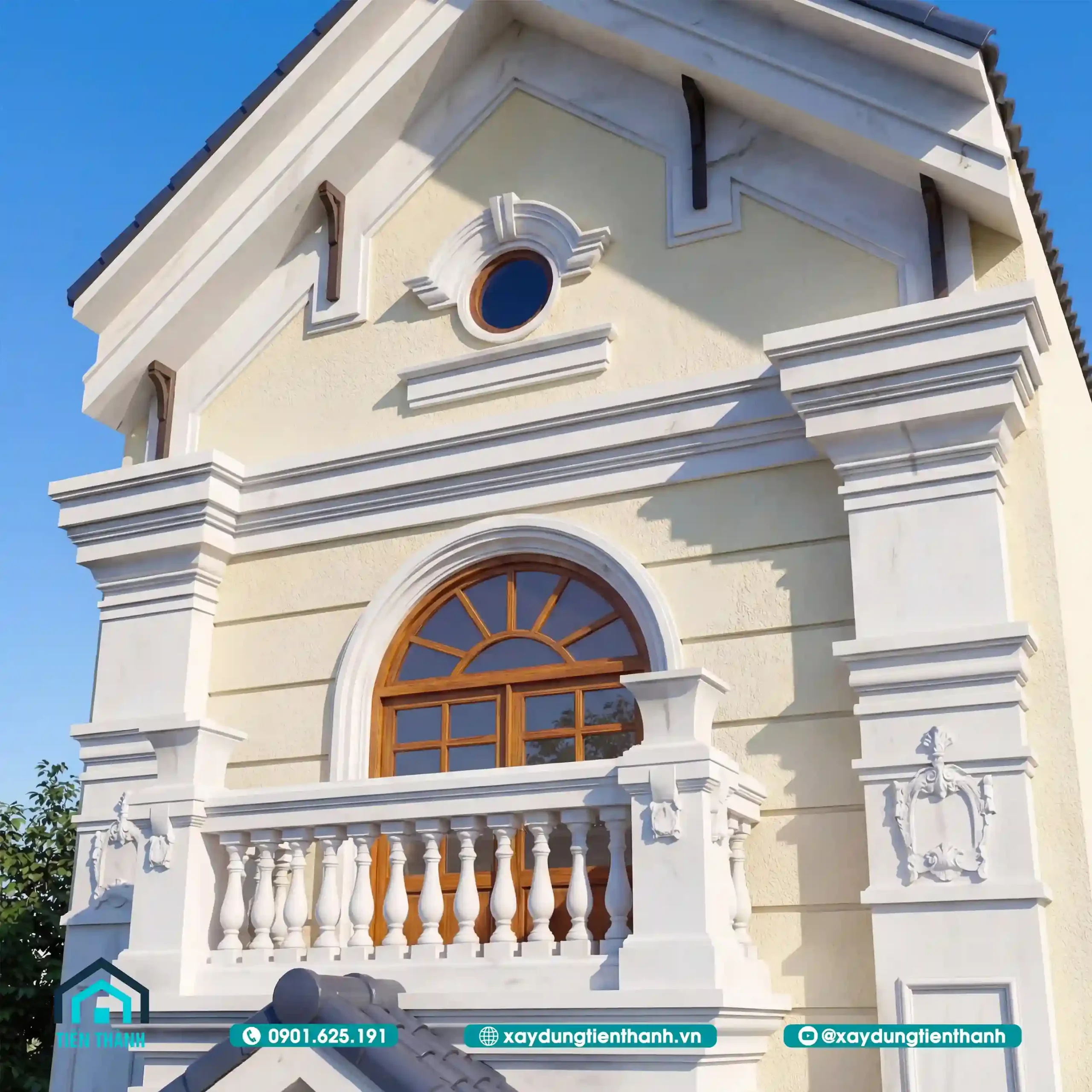 Cận cảnh chi tiết phào chỉ và ô cửa sổ vòm tại tầng 2 của ngôi nhà.
