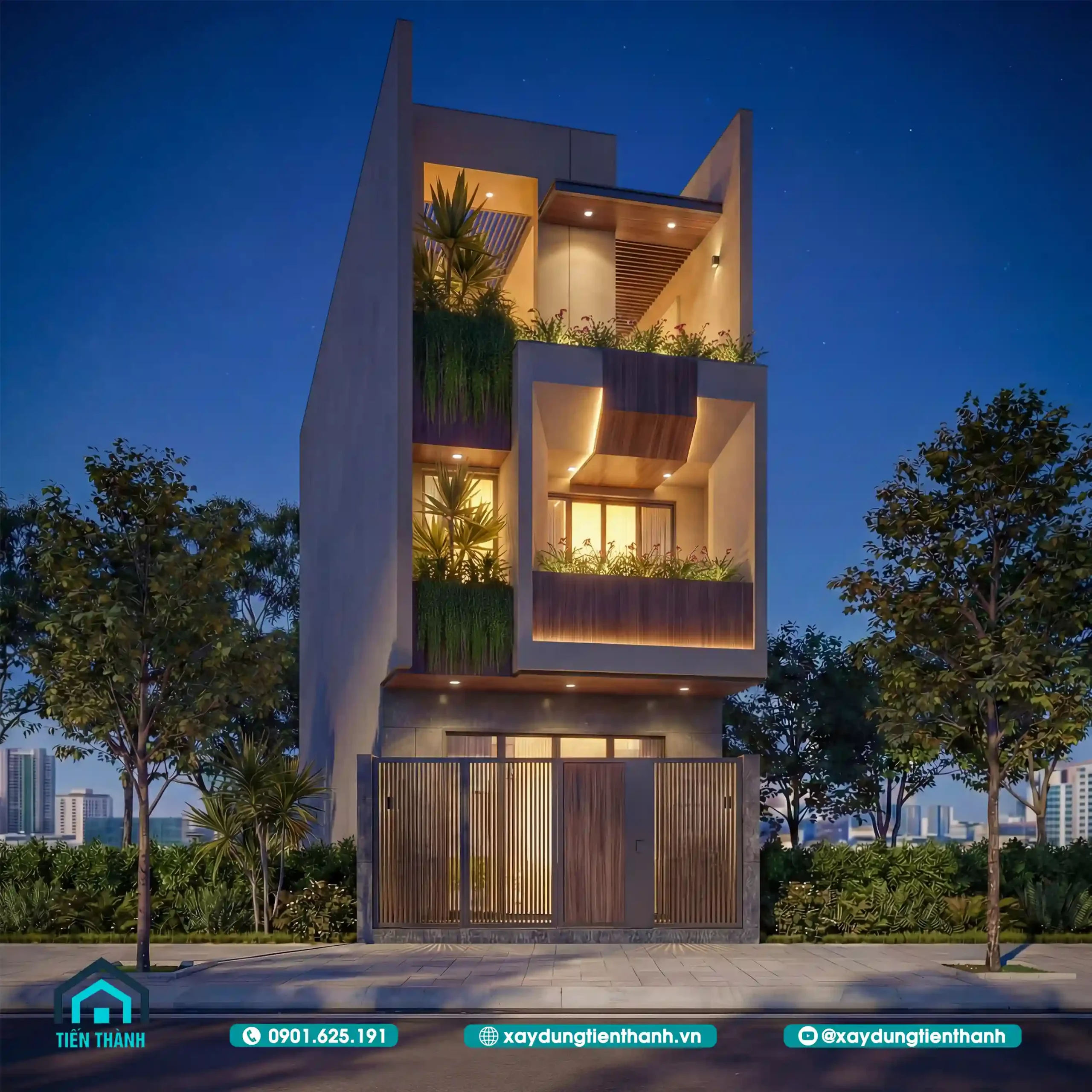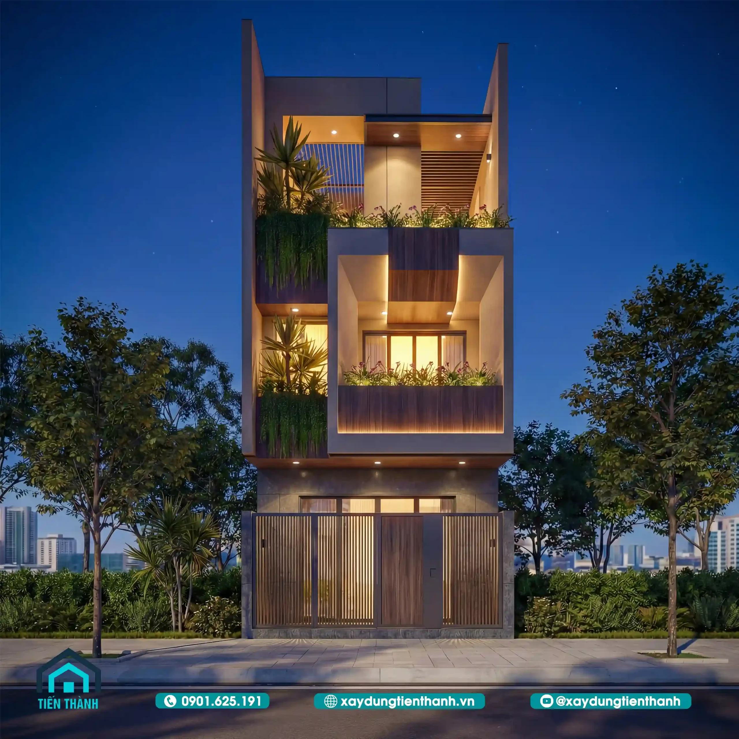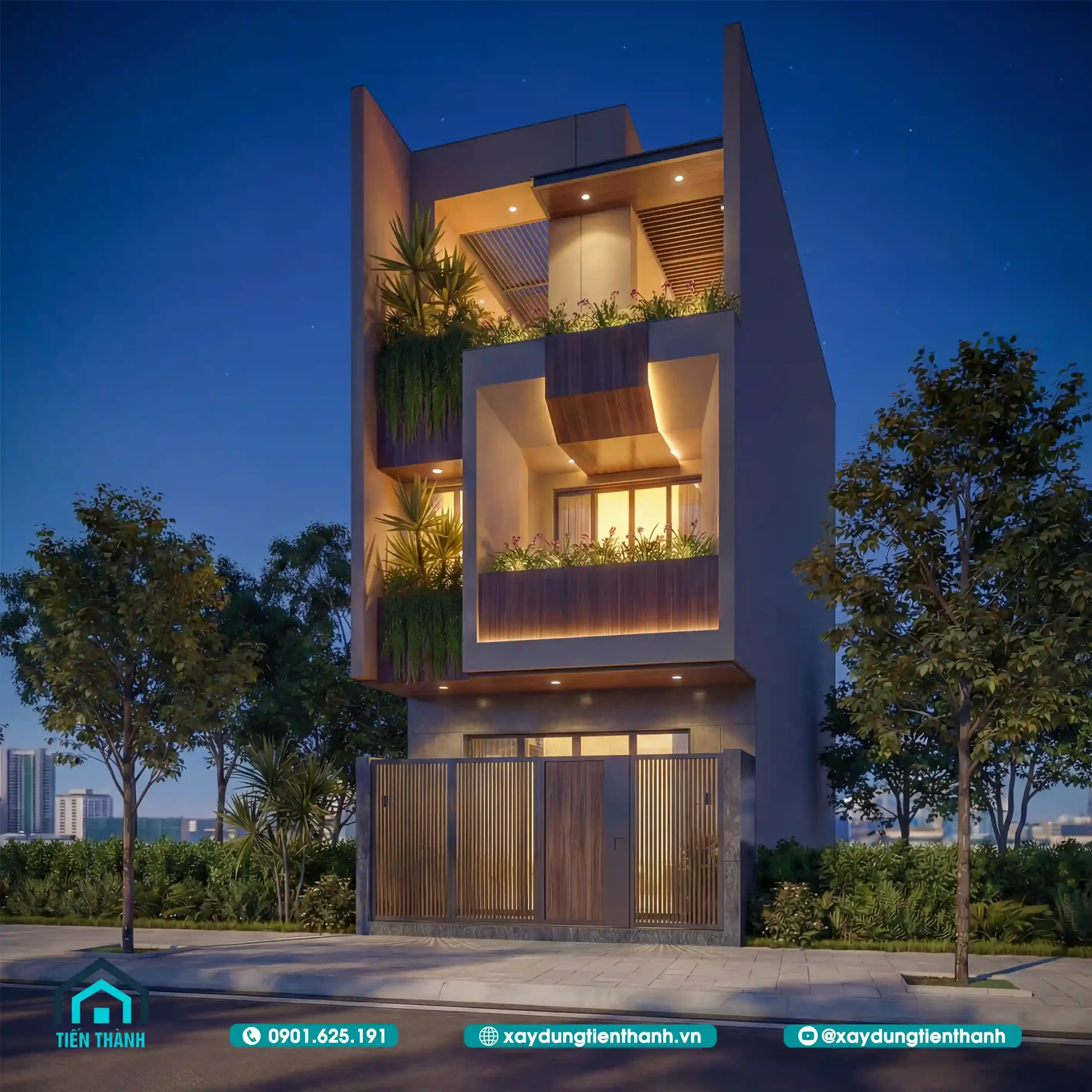 Việc lồng ghép cây xanh vào thiết kế nhà 3 tầng đẹp không chỉ là chạy theo xu hướng mà còn mang lại lợi ích thực tế về sức khỏe. Như bạn thấy trong các phối cảnh đêm, ánh sáng xuyên qua kẽ lá tạo nên những mảng đổ bóng nghệ thuật trên tường.