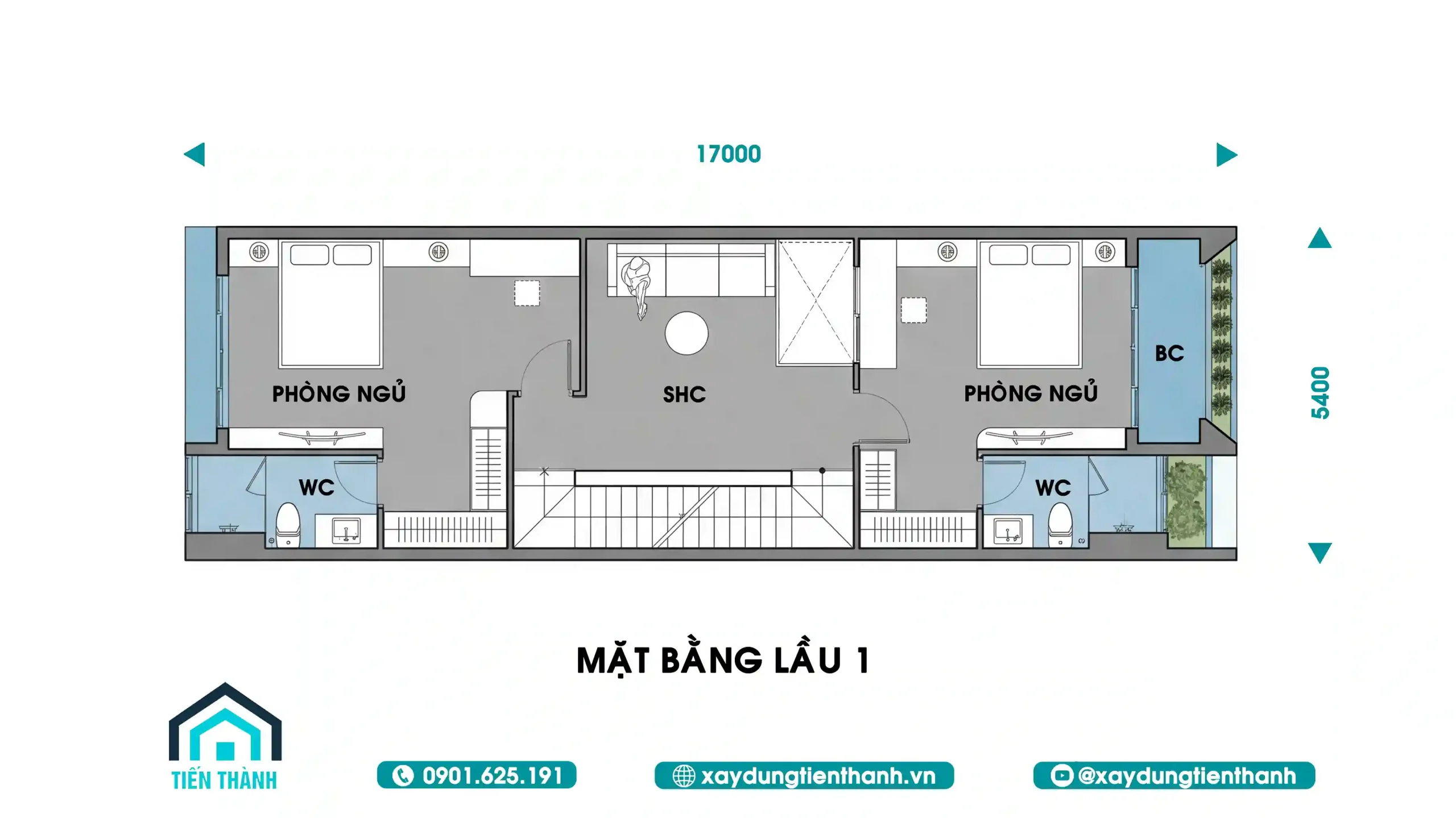 Trong bản thiết kế nhà 3 tầng đẹp, lầu 1 thường là “trái tim” nghỉ ngơi của cả gia đình. Với diện tích 5.4m x 17m, việc phân chia hai phòng ngủ lớn ở hai đầu nhà giúp tạo ra sự riêng tư tuyệt đối cho các thành viên.
