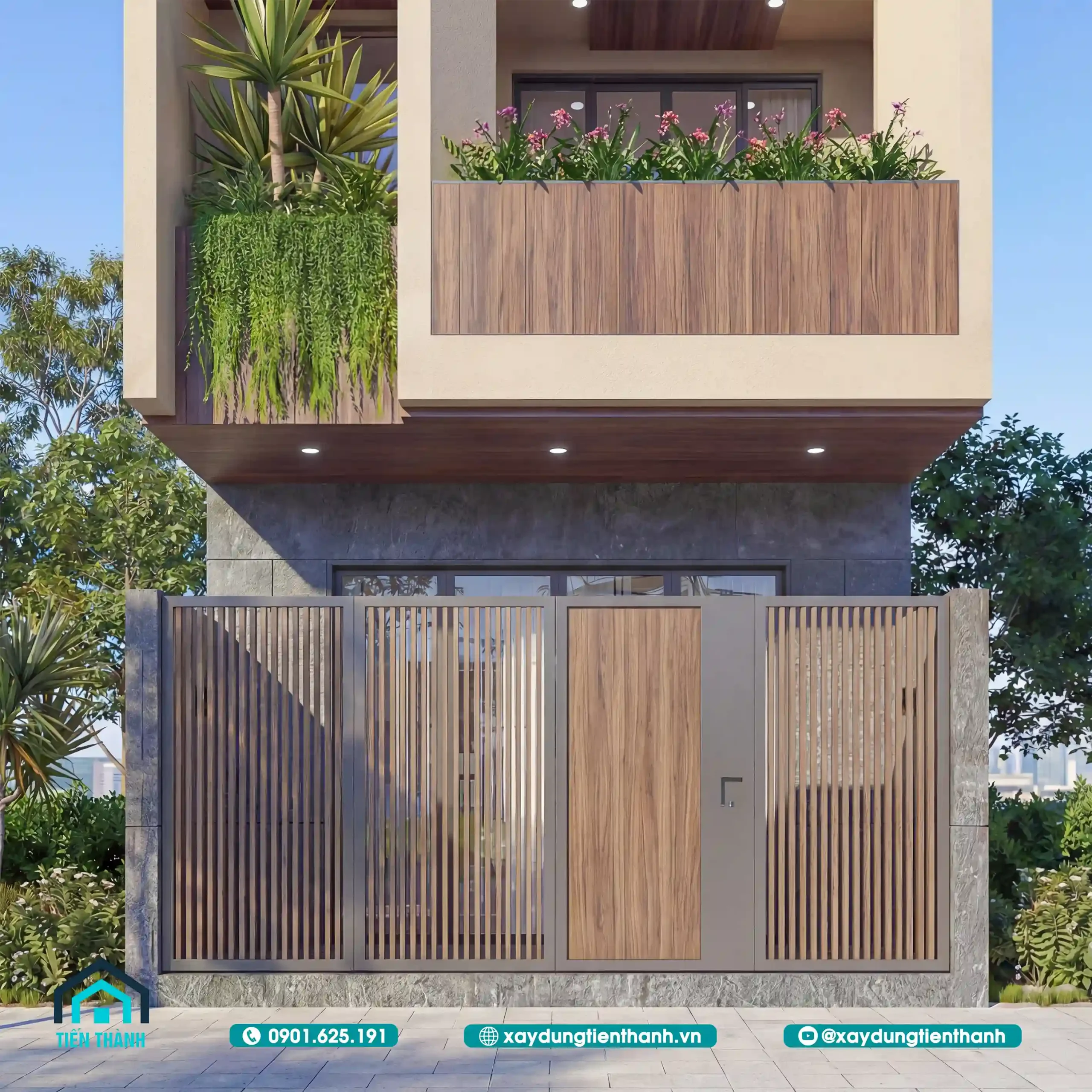 Cận cảnh hệ cổng gỗ và mảng xanh trang trí hài hòa tại lối vào nhà phố 3 tầng.