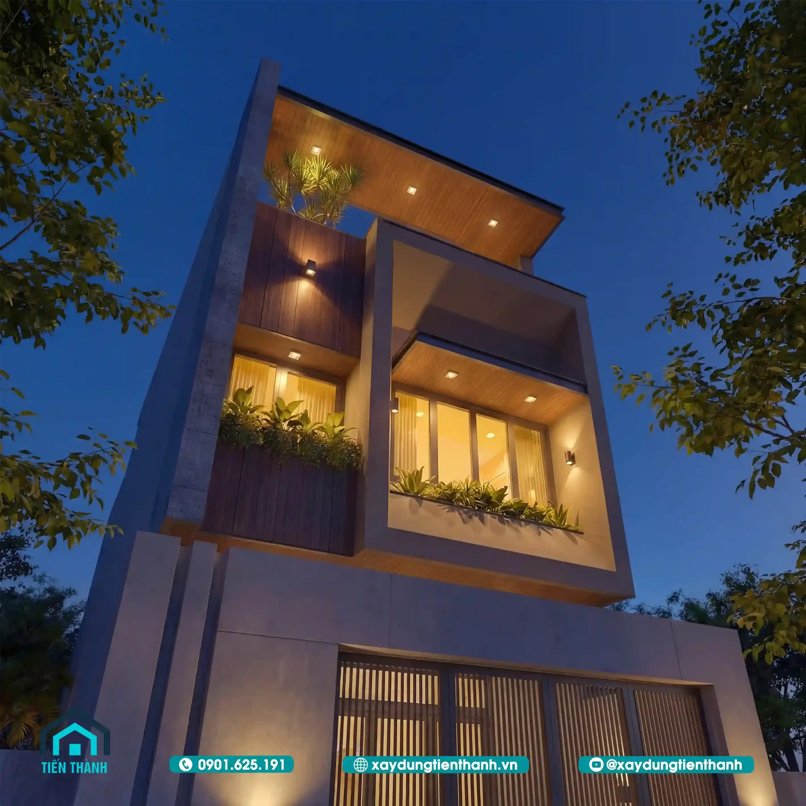Mẫu thiết kế mà chúng ta đang theo dõi sử dụng tông màu trung tính làm chủ đạo. Sự kết hợp giữa màu nâu trầm của gỗ ốp và màu xám xi măng tạo nên một diện mạo mạnh mẽ nhưng không kém phần thanh lịch. Hệ thống ban công được tận dụng tối đa để trồng cây xanh, giúp lọc bụi và điều hòa không khí cho các phòng ngủ phía trước.