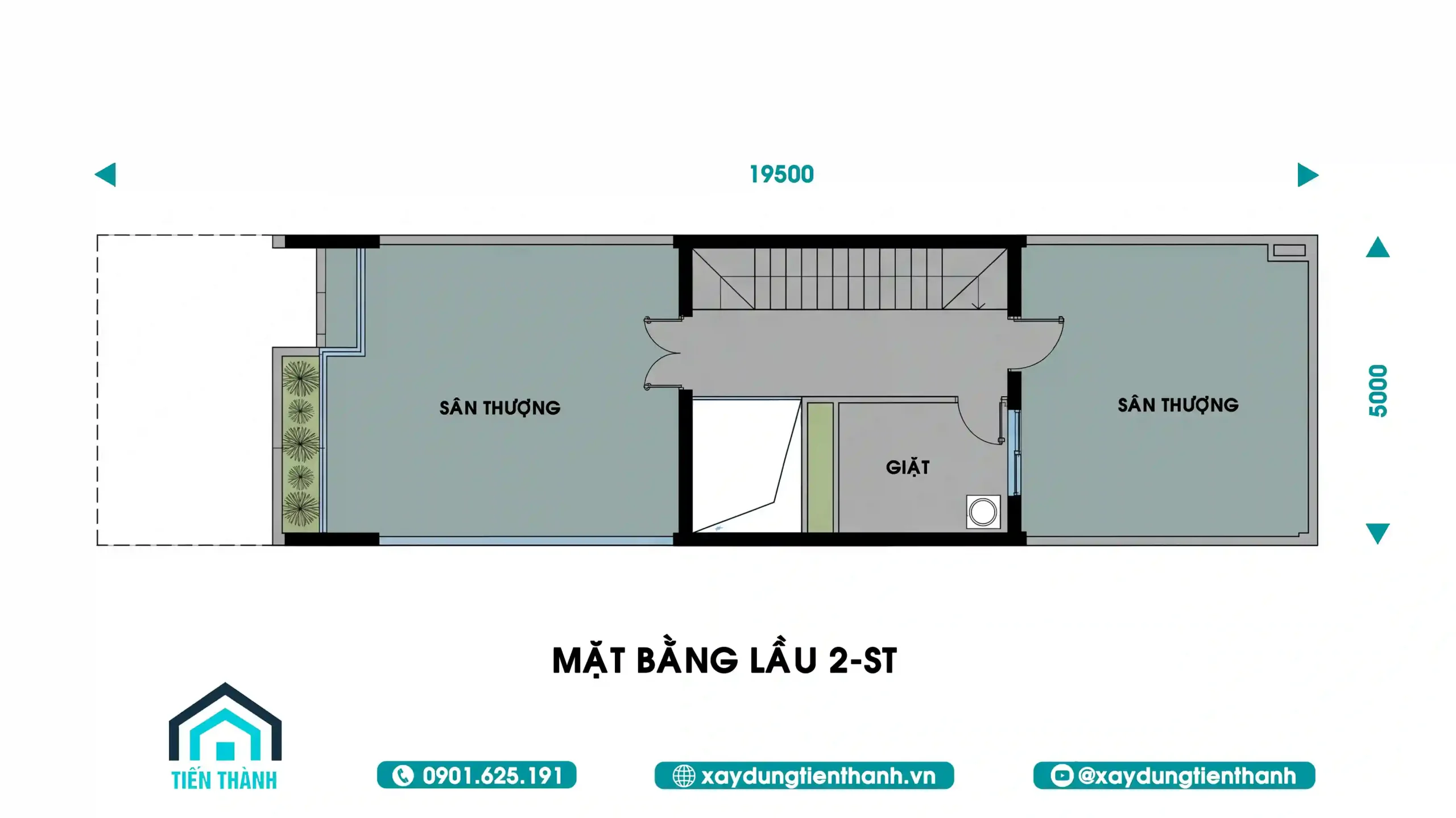 Thiết kế lầu 2 tập trung vào các khoảng hở. Sân thượng phía trước rộng rãi có thể cải tạo thành vườn hoa hoặc nơi thưởng trà. Khu vực giặt được bố trí ở giữa, kết nối trực tiếp với sân thượng phía sau để thuận tiện cho việc phơi phóng mà không ảnh hưởng đến thẩm mỹ mặt tiền.