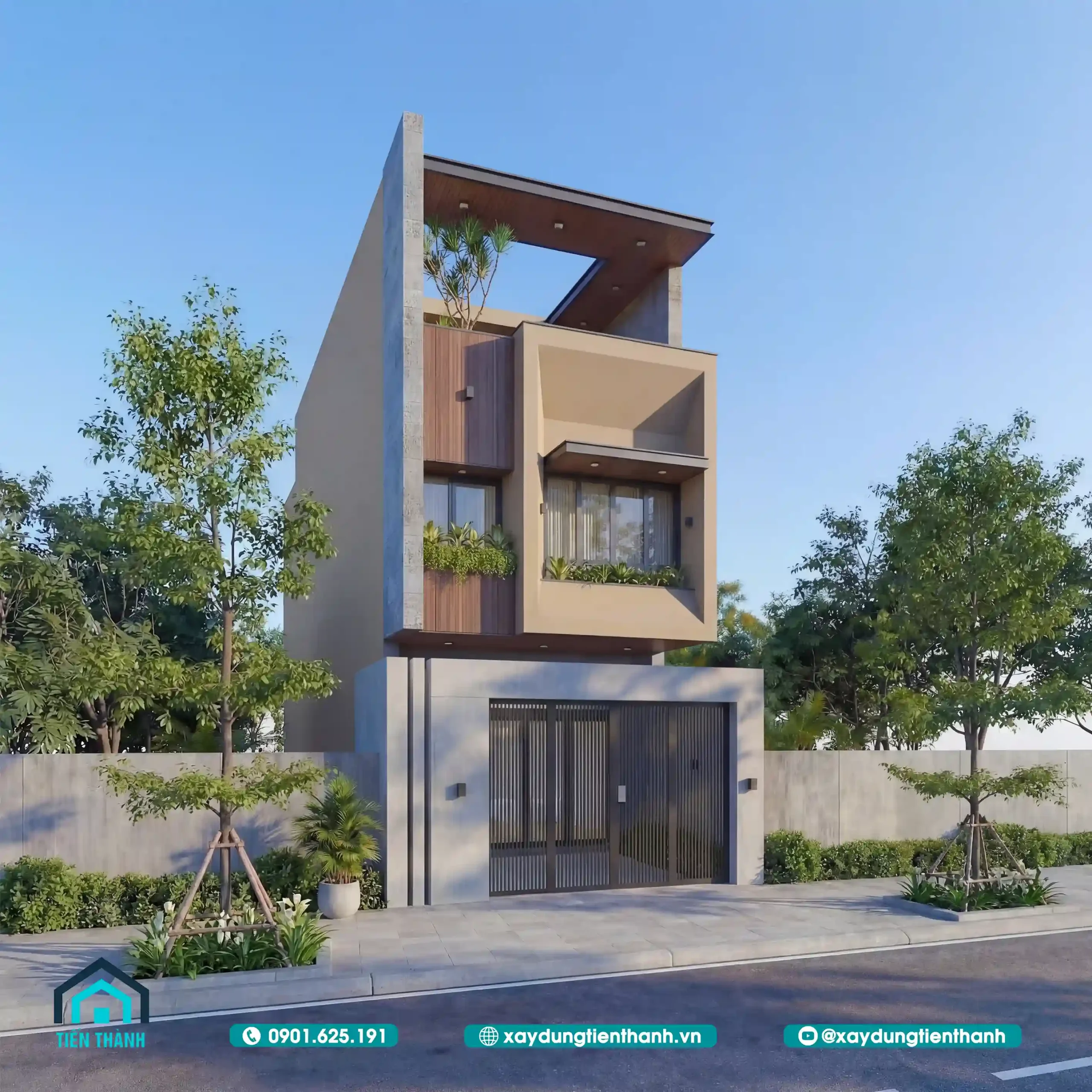 Phối cảnh chính diện mặt tiền nhà phố 3 tầng hiện đại với mảng xanh ban công.
