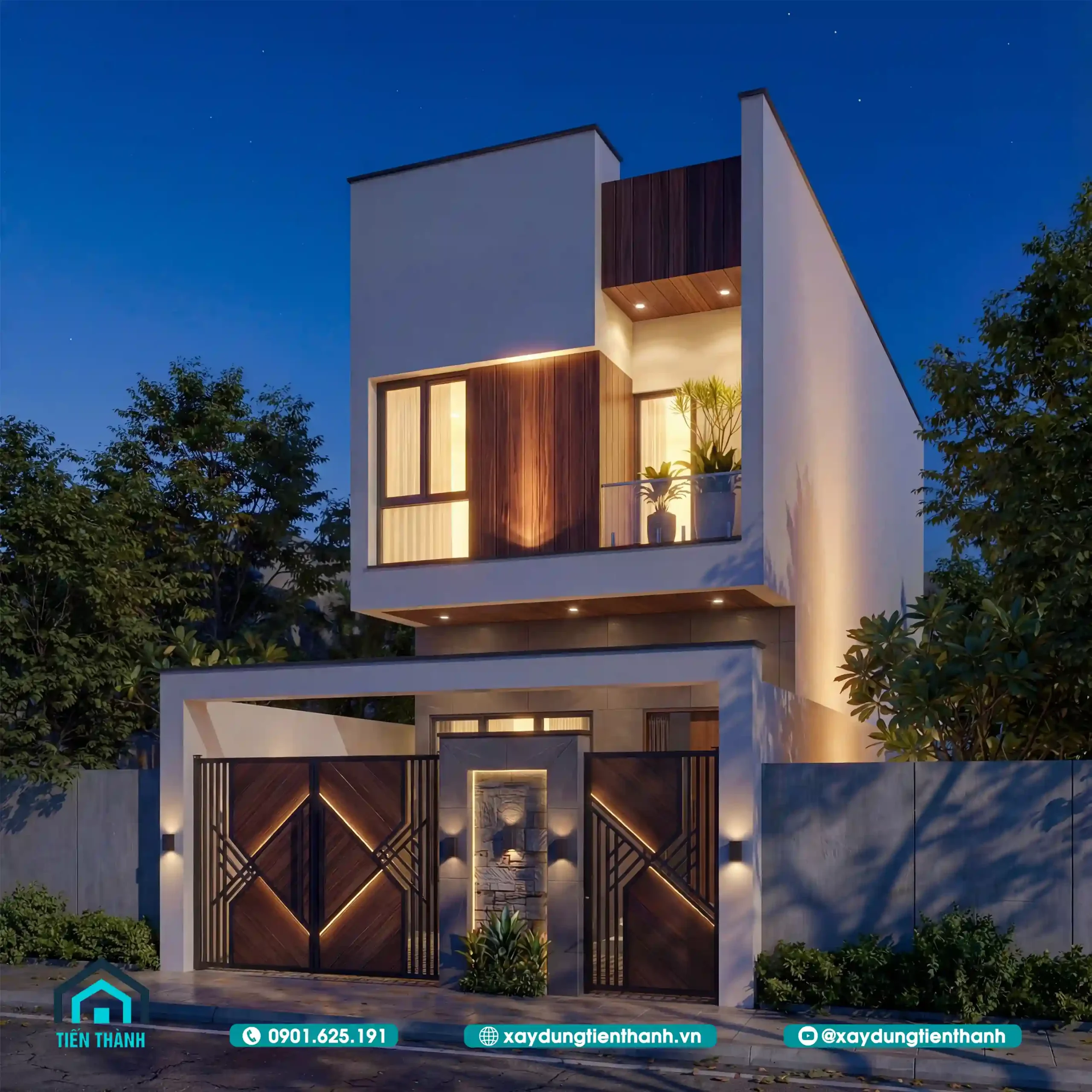 Nhà phố hai tầng hiện đại với tông trắng, ốp gỗ sang trọng và cổng rào tinh tế.