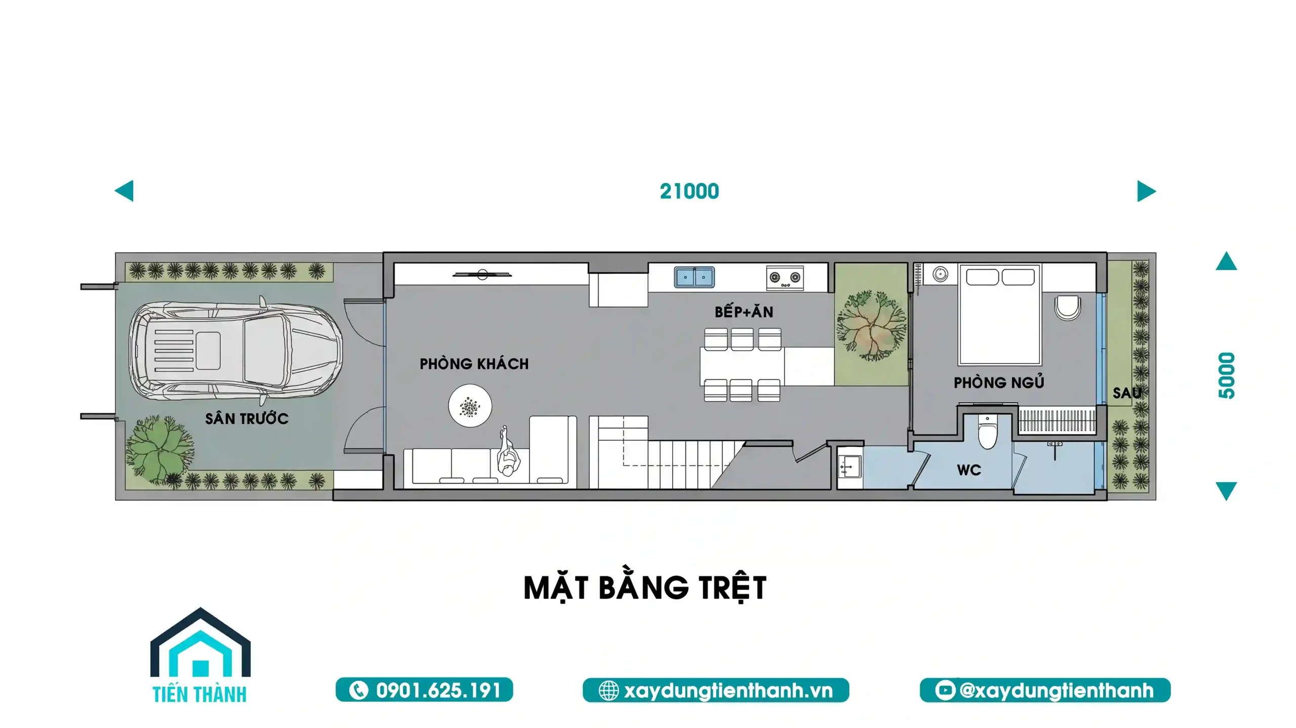 - Sân trước: Chiều dài khoảng 5-6m được tận dụng làm khu vực để xe ô tô và bố trí tiểu cảnh cây xanh hai bên.