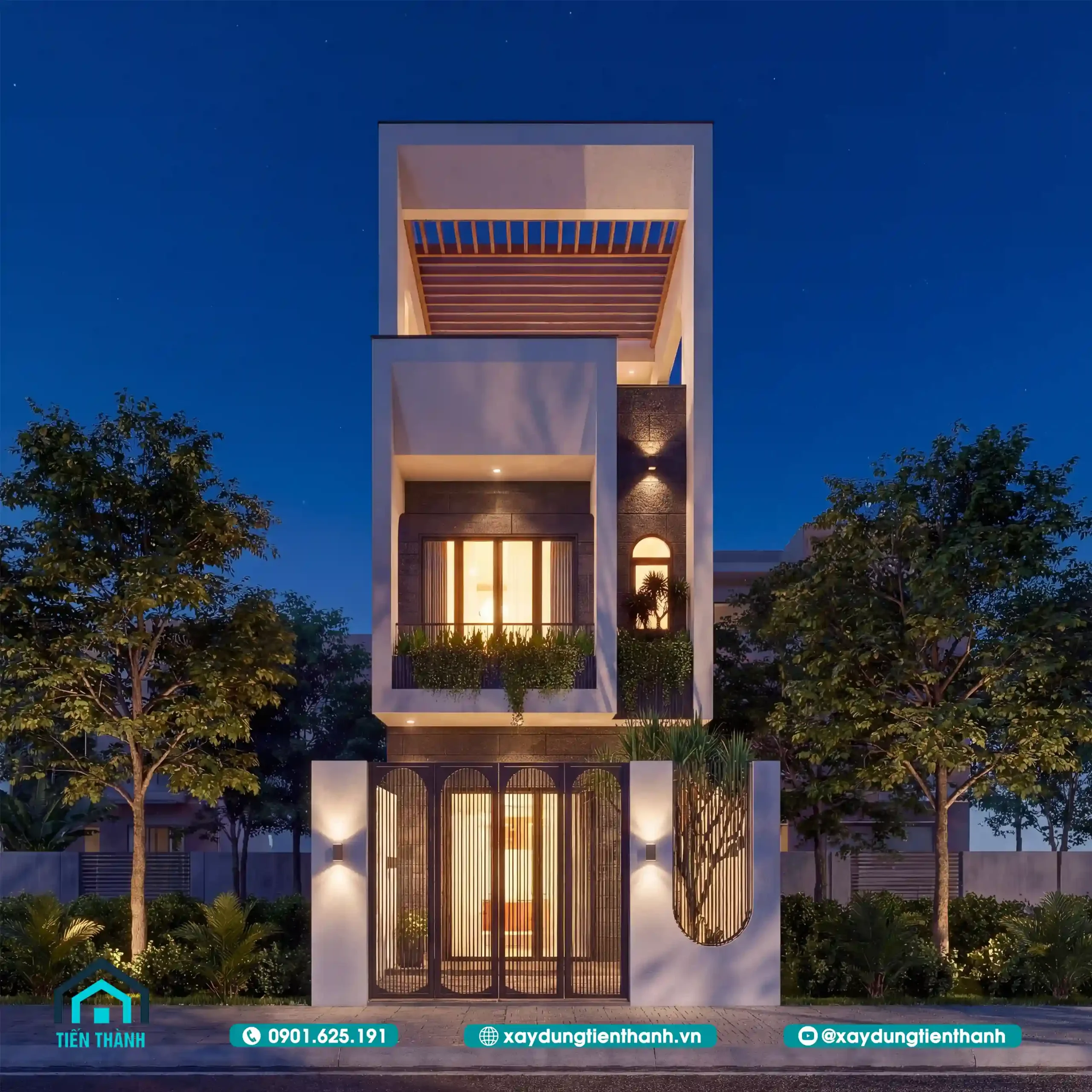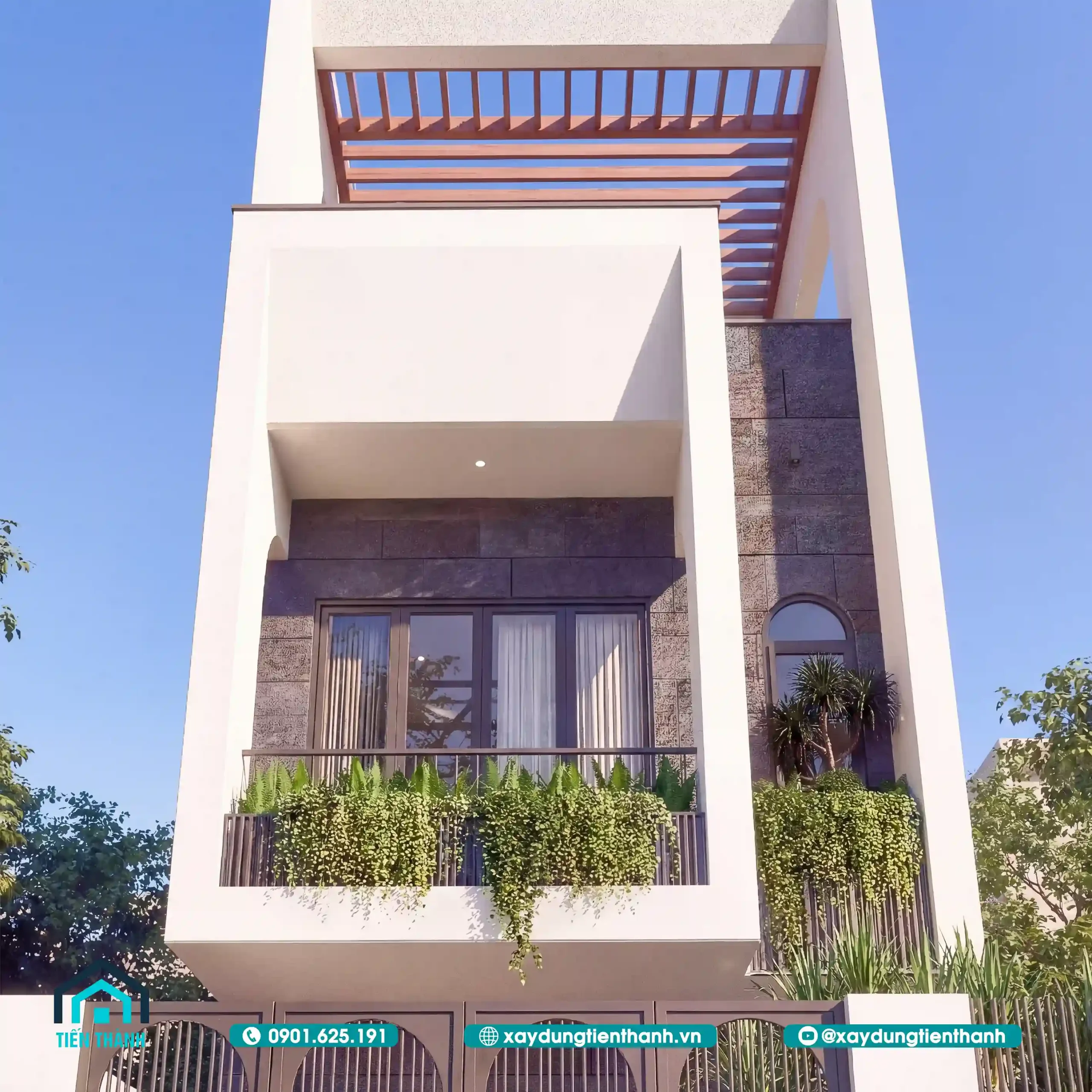 Toàn cảnh mặt tiền nhà ống 3 tầng 5x20m với phong cách kiến trúc hiện đại, xanh mát.