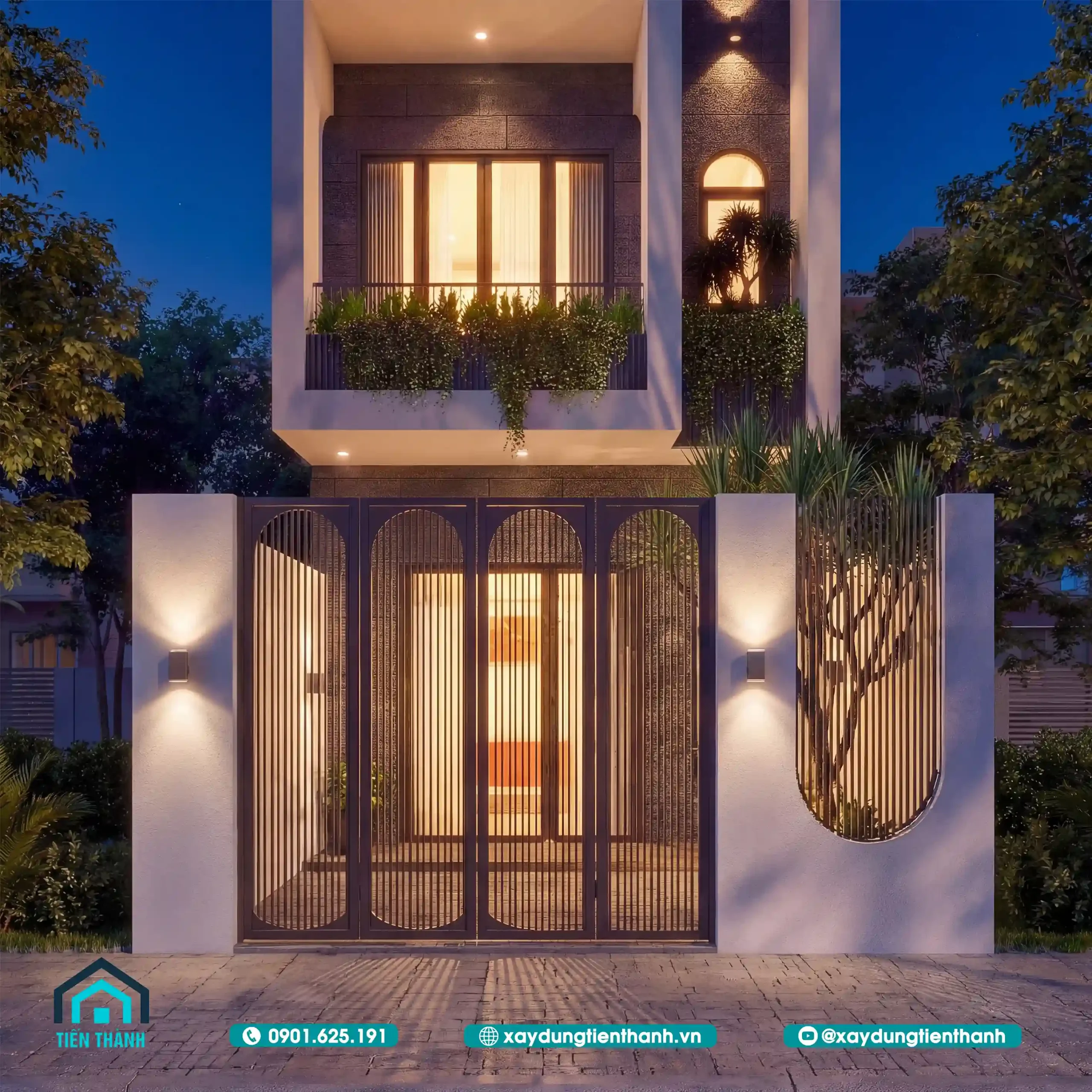 Màu sắc chủ đạo là trắng tinh khôi kết hợp với ốp đá xám đen ở tầng 2, tạo nên sự tương phản mạnh mẽ nhưng hài hòa. Đặc biệt, hệ cổng sắt với những đường cong vòm mềm mại giúp làm giảm bớt vẻ thô cứng của các khối bê tông.