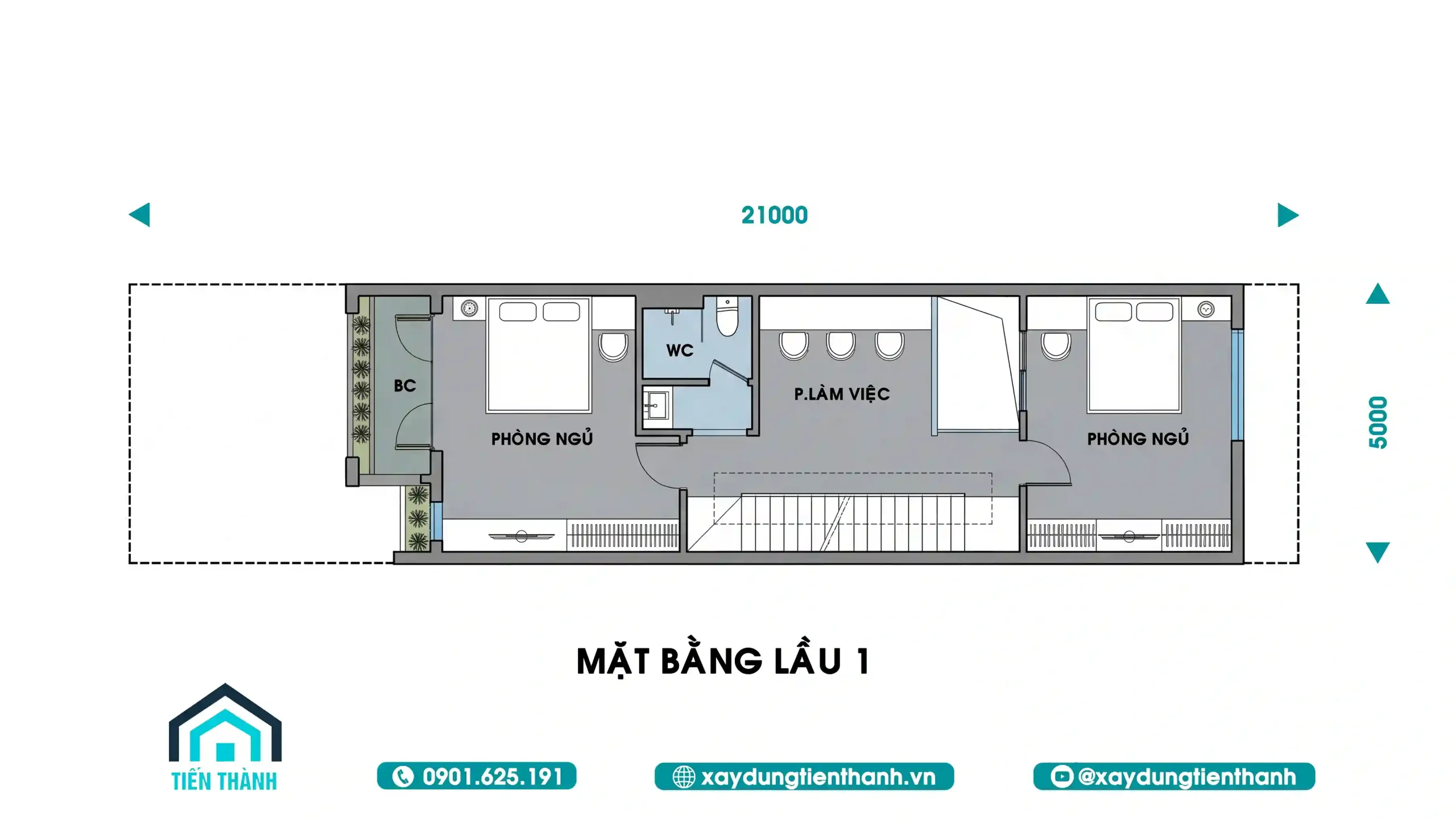 Mặt bằng lầu 1 tập trung vào không gian nghỉ ngơi với các phòng ngủ và phòng làm việc.