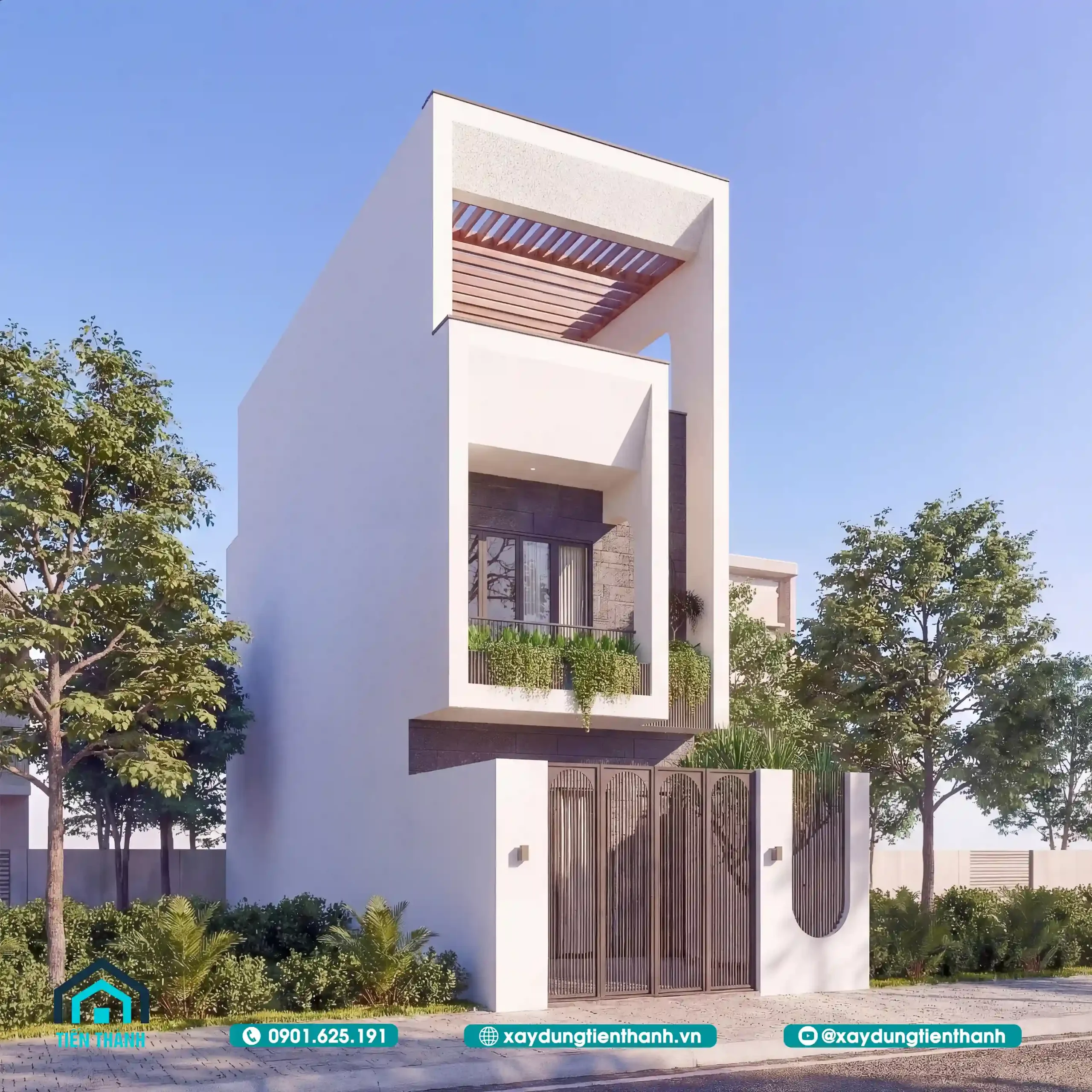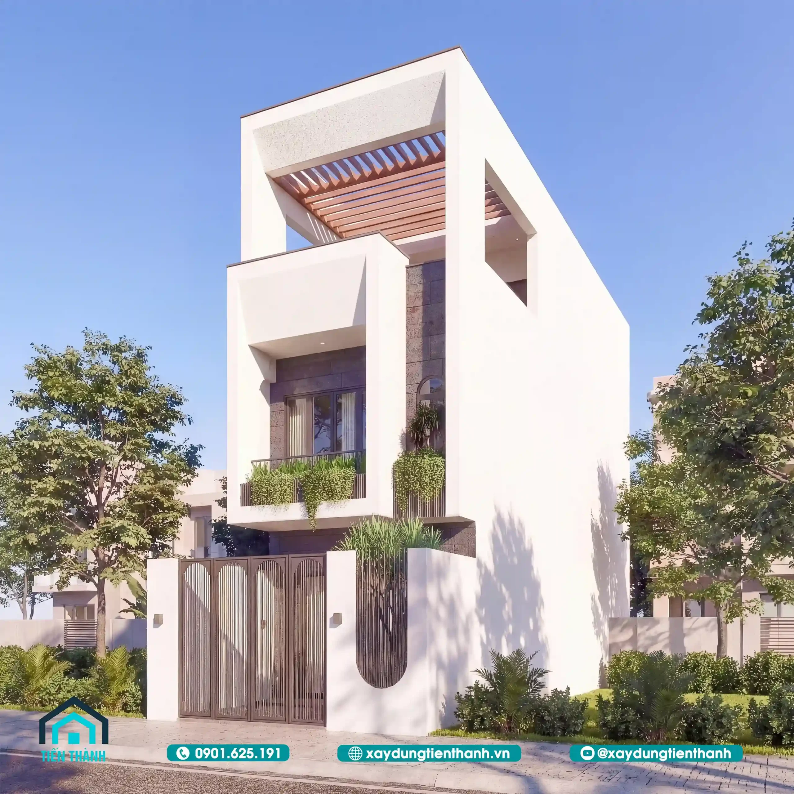 Phối cảnh chính diện ngôi nhà tối giản với hệ lam gỗ trên sân thượng đầy nắng.