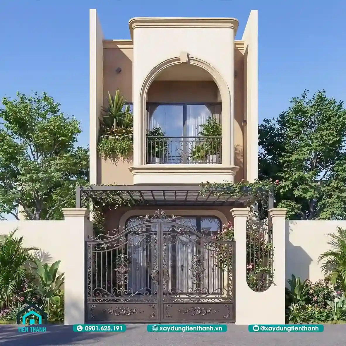 Phong cách tân cổ điển mang lại vẻ đẹp quyền quý và trường tồn. Những đường vòm cong nhẹ nhàng tạo nên sự mềm mại cho công trình. Lan can sắt mỹ thuật là điểm nhấn không thể thiếu cho phong cách.